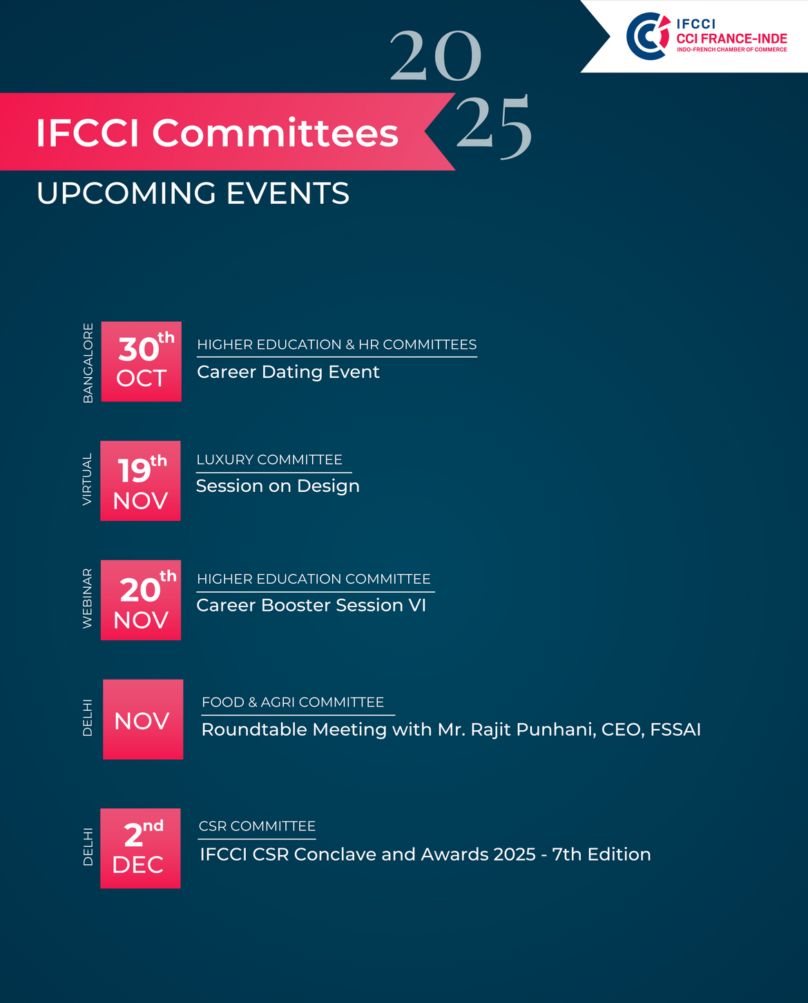 The Indo-French Chamber of Commerce and Industry in India is glad to share with you the Committees Activity Calendar for October - December 2025.