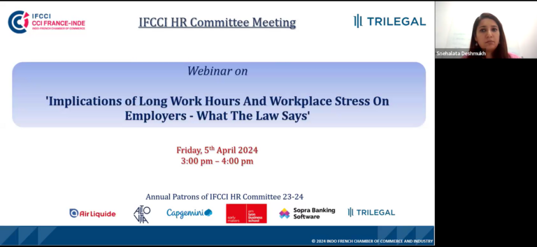 IFCCI HR Committee in association with Trilegal organised a knowledge session on 5th April 2024 on the topic, ‘Implications of long work hours and workplace stress on employers – what the law says’. This insightful webinar witnessed participation of 40 Members of IFCCI HR Committee.