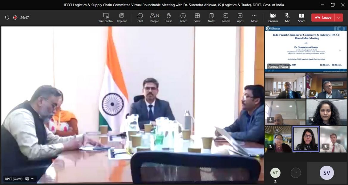The Indo-French Chamber of Commerce and Industry (IFCCI) convened a virtual Roundtable meeting with Dr. Surendra Ahirwar, Joint Secretary- Logistics and Trade, Department for Promotion of Industry and Internal Trade (DPIIT), Ministry of Commerce and Industry, Government of India, on 22nd February 2024.