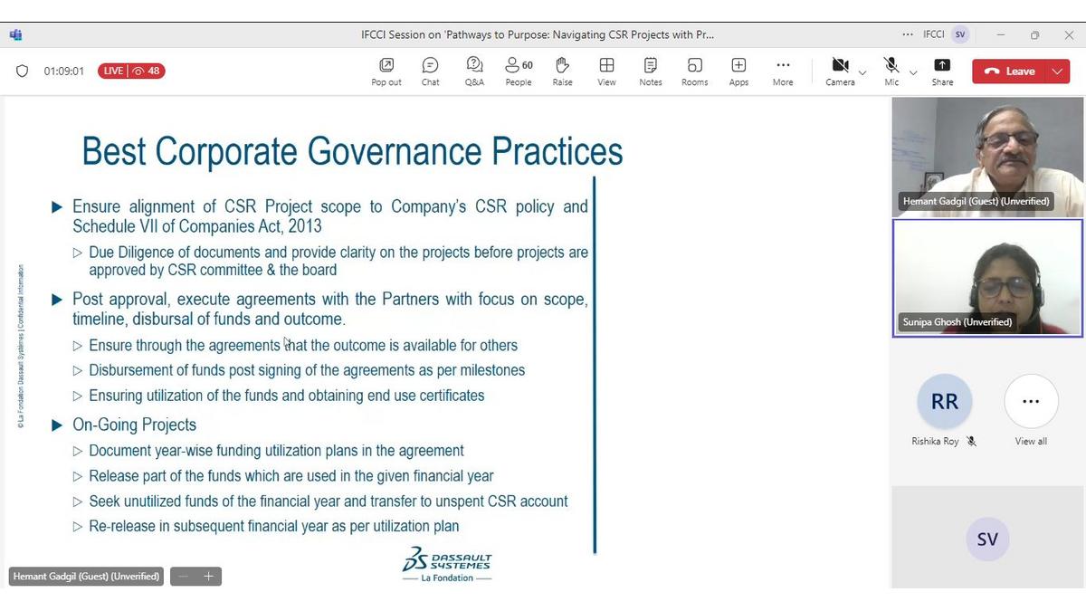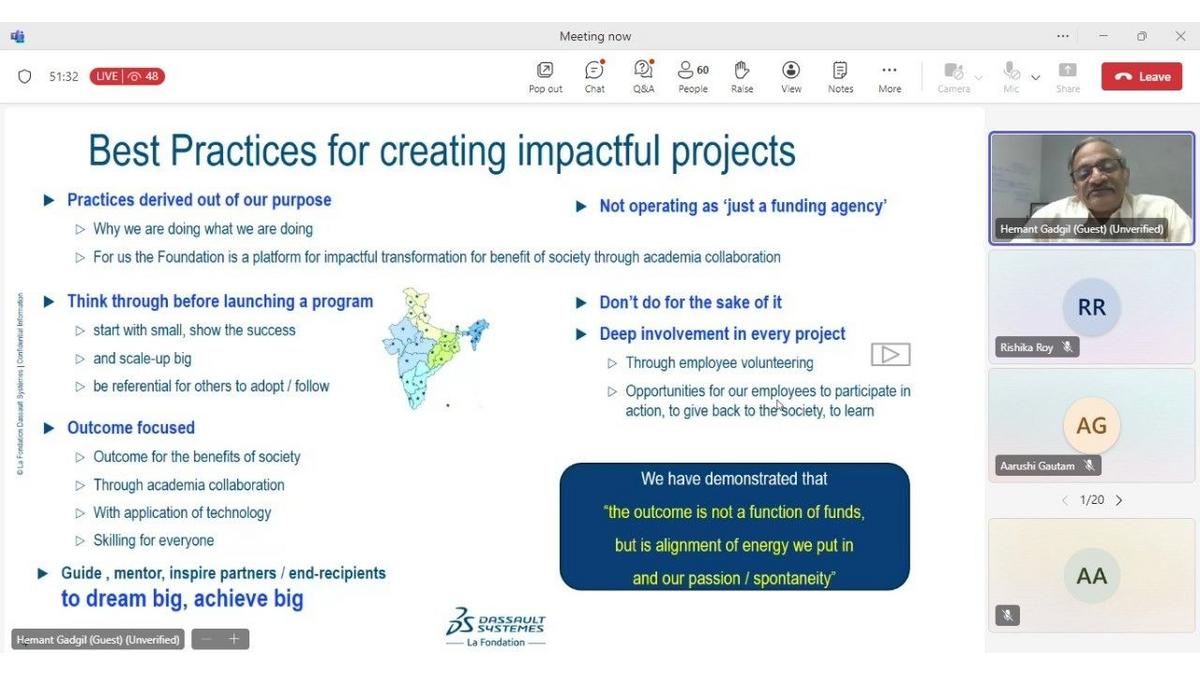 Mr. Hemant Gadgil, Program Director & Mentor, Dassault Systèmes Foundation, India, and Ms. Sunipa Ghosh, Director & Legal Head - India, Dassault Systèmes Group shared best practices for impactful CSR project management and interesting learnings through the entire process from project selection to project closure, as well as the legal and financial aspects pertaining to due diligence, board approvals, etc.