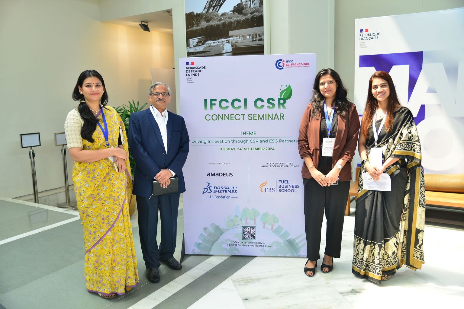 - Panel Discussion on CSR Innovation, expertly moderated by Ms. Priyam Dhamankar, Vice Chairperson of the IFCCI CSR Committee and Legal and Compliance Director at Servier India, who led an engaging discussion with Ms. Anuradha Suvarna, Head of Sustainability & CSR at L’Oréal India; Mr. Hemant Gadgil, Program Director & Mentor at La Fondation Dassault Systèmes; Ms. Ribu Choudary, Head of CSR and Diversity, Equity, and Inclusion at Amadeus; and Dr. Richa Gautam, Sustainability & CSR Leader for the Greater India Zone at Schneider Electric India, on how businesses are integrating innovation into their CSR initiatives and programs.