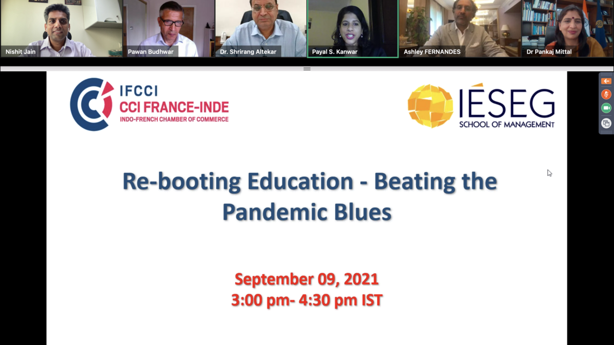 IFCCI under the aegis of the Higher Education Committee organised a webinar on ‘Re-booting Education – Beating the Pandemic Blues’ on 9th September 2021. Payal S. Kanwar, Director General, IFCCI set the context of the webinar and introduced the leadership of the committee. Mr. Ashley Fernandes, Country Head India, emlyon business school, Chairman Joint-Board XAVIER-EMLYON Business School & Chairman, IFCCI Higher Education Committee, introduced and discussed the mission of the committee and speakers for the session, Dr. (Mrs.) Pankaj Mittal, Secretary General, Association of Indian Universities and Prof Pawan Budhwar, Head, Aston Business School- UK. Prof (Dr.) Shrirang Altekar, Professor & Director, Symbiosis Institute of Business Management, Nagpur & VC, IFCCI Higher Education Committee moderated the session.