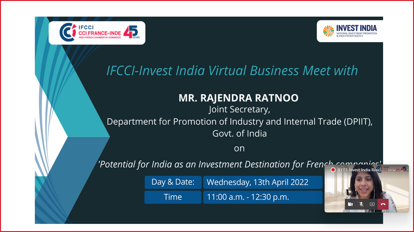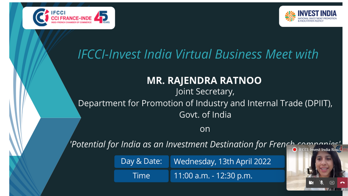 Indo-French Chamber of Commerce & Industry (IFCCI) under the aegis of its CFO Committee, and in association with Invest India, organised a virtual Roundtable Meeting with Mr. Rajendra Ratnoo, Joint Secretary, DPIIT, Govt. of India on 'Potential for India as an Investment destination for French companies', on Wednesday, 13th April 2022.