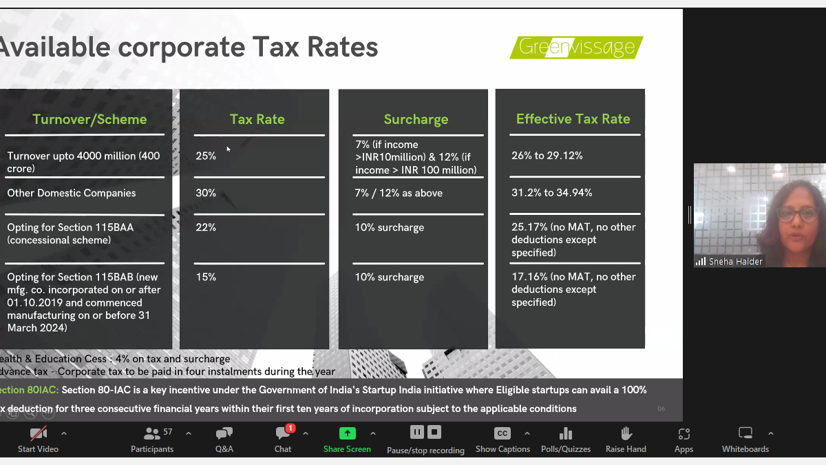 Available corporate tax rates in India - Overview of standard and concessional tax rates, including startup incentives under Section 80-IAC and applicable surcharges and cess