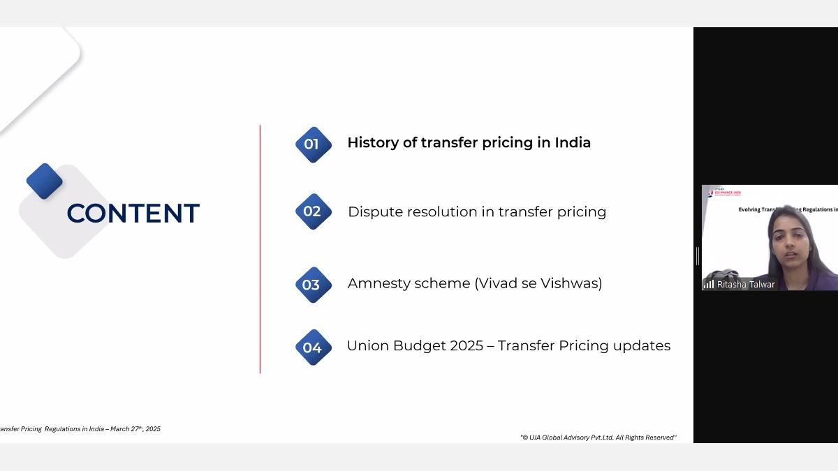The session was led by Ms. Ritasha Talwar – Senior Partner Audit & Assurance – UJA and Shrushti Agiwal – Analyst Transfer Pricing – UJA with their presentation. The session delved into the history and evolution of Transfer Pricing (TP) in India, covering key topics such as: