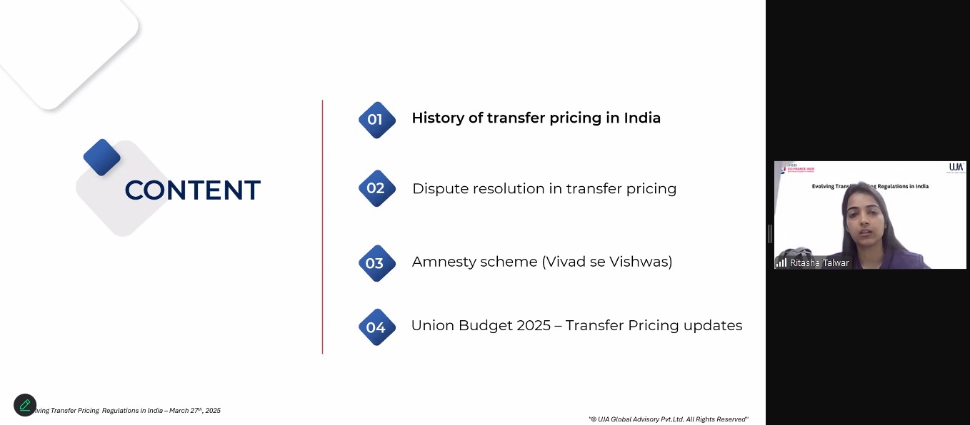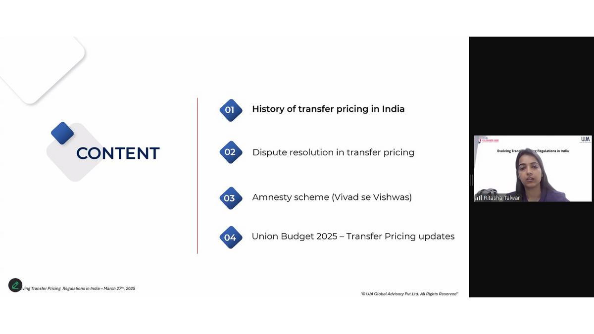 The session was led by Ms. Ritasha Talwar – Senior Partner Audit & Assurance – UJA and Shrushti Agiwal – Analyst Transfer Pricing – UJA with their presentation. The session delved into the history and evolution of Transfer Pricing (TP) in India, covering key topics such as: