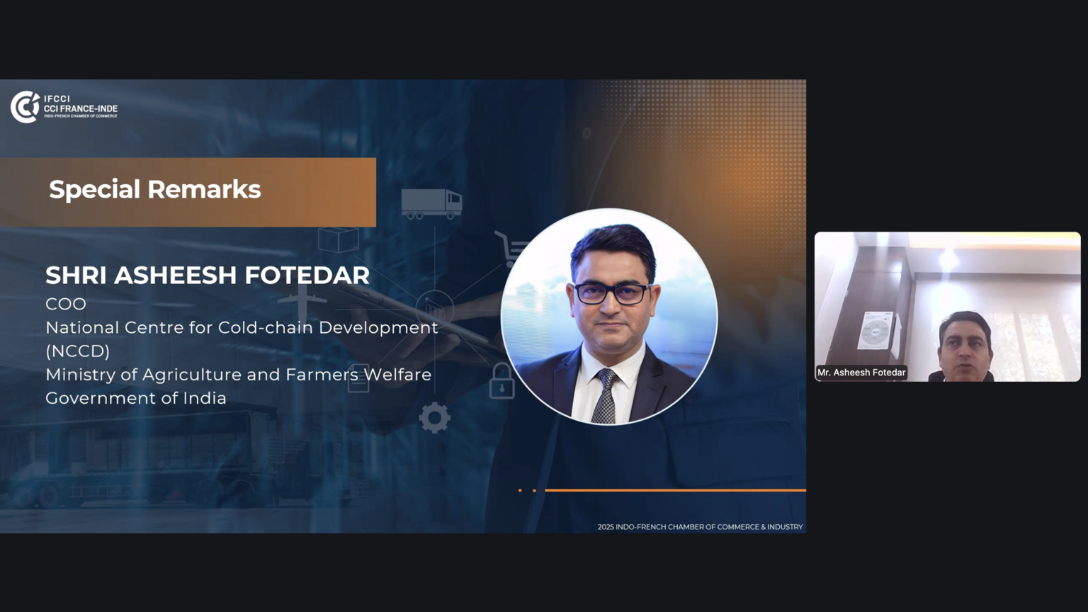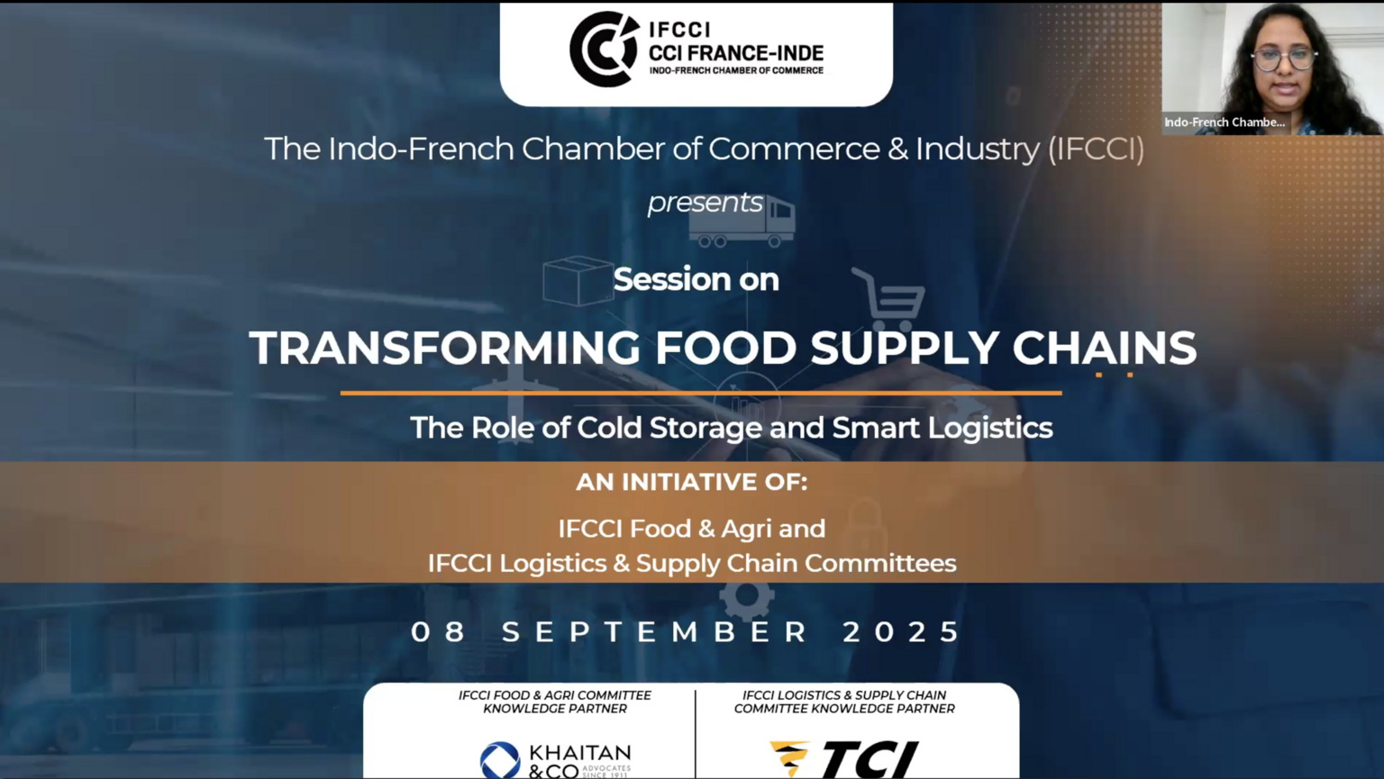 The Indo-French Chamber of Commerce & Industry (IFCCI) organized a virtual session on “Transforming Food Supply Chains: The Role of Cold Storage and Smart Logistics” on Monday, 8th September 2025. Jointly hosted by IFCCI’s Food & Agri and Logistics & Supply Chain Committees, the session brought together industry leaders and experts to discuss how cold storage infrastructure and smart logistics can make India’s food supply chains more sustainable, resilient, and future-ready.
