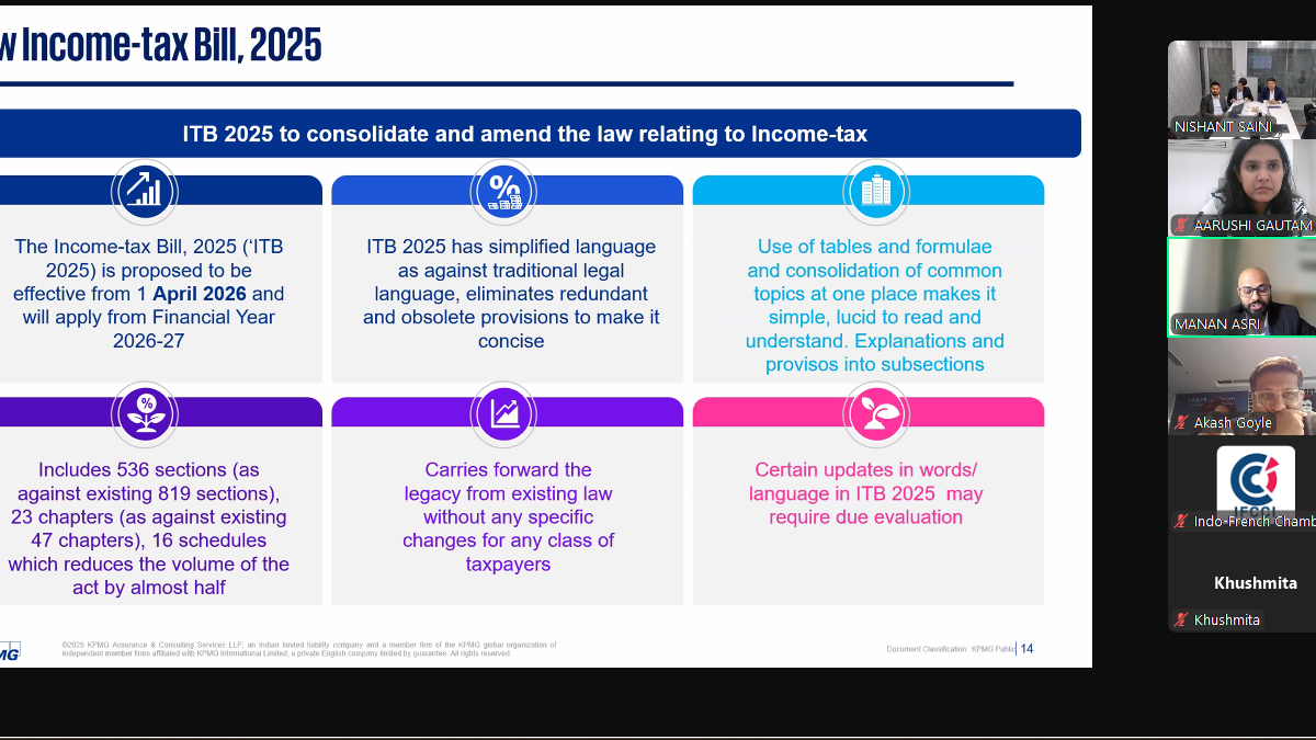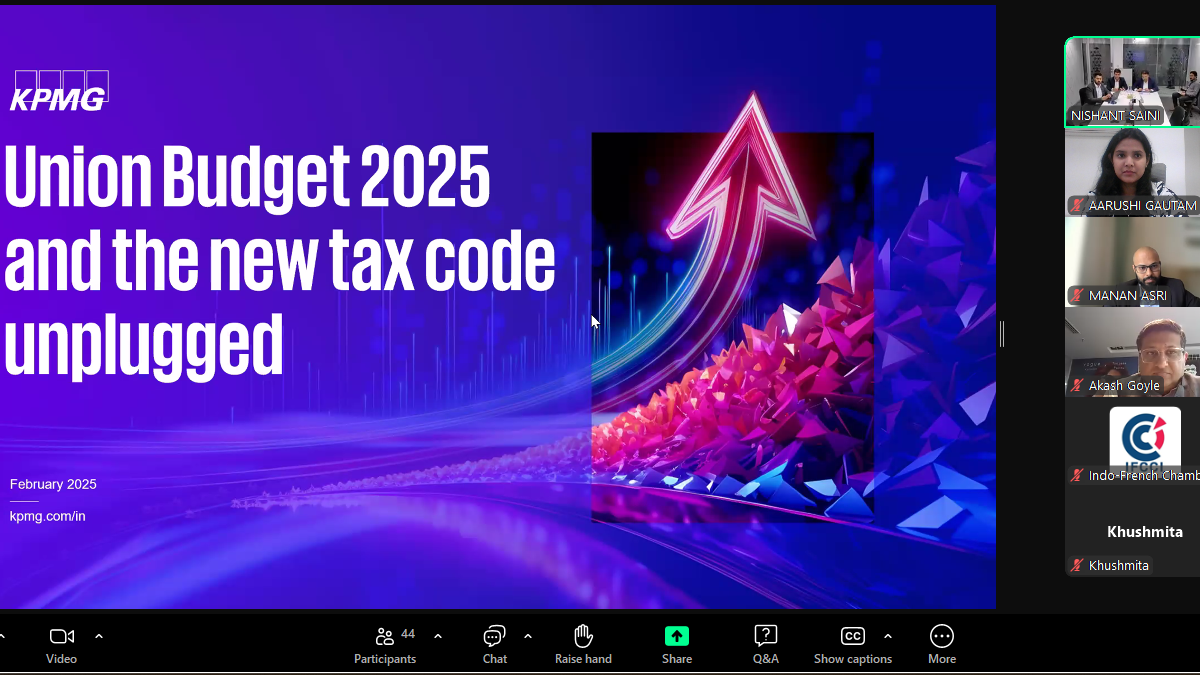 The Indo-French Chamber of Commerce & Industry (IFCCI), in collaboration with KPMG in India, hosted an engaging virtual session on "Union Budget & Income Tax Bill 2025 Unplugged: What You Need to Know for Your Business" in February 2025.