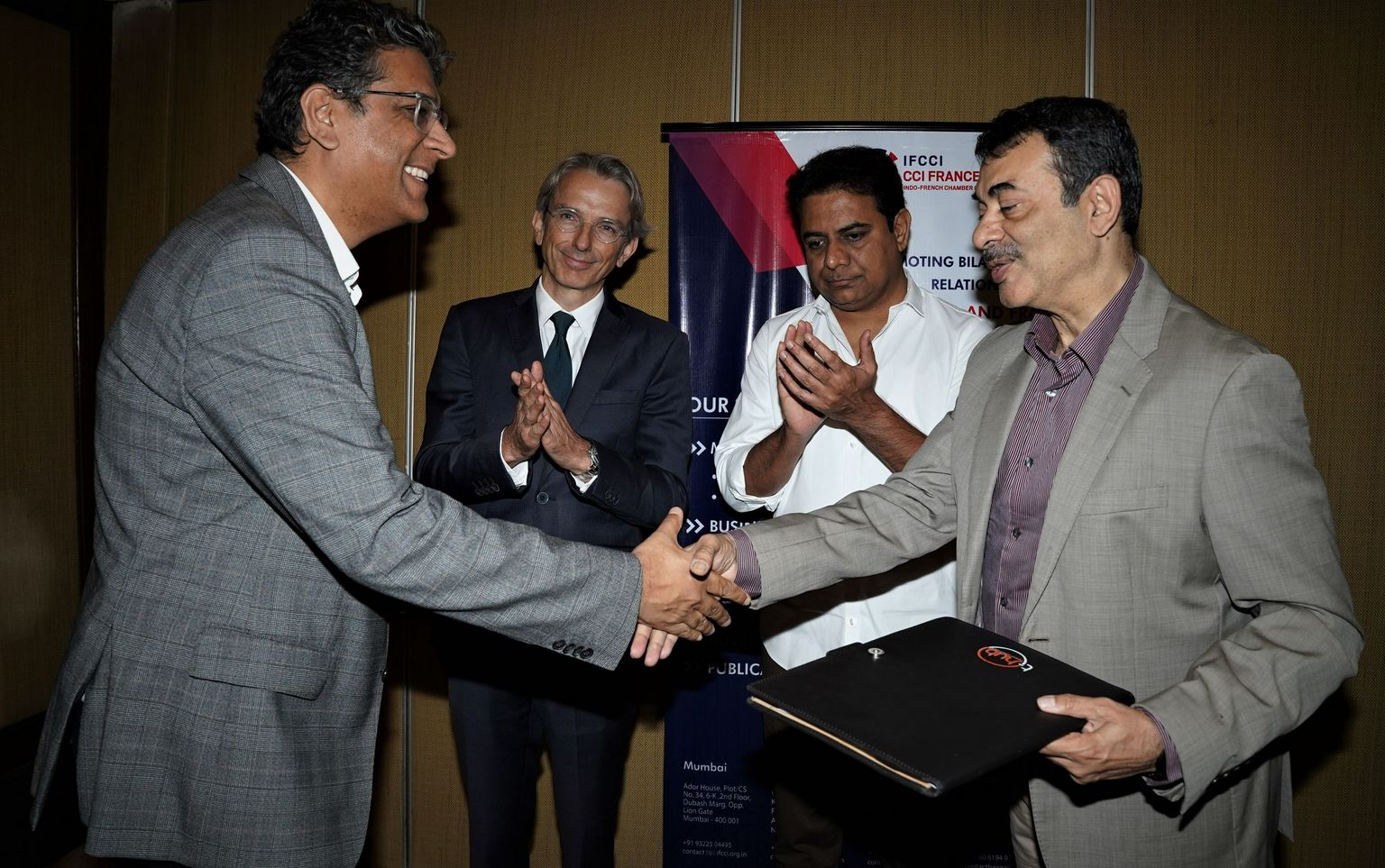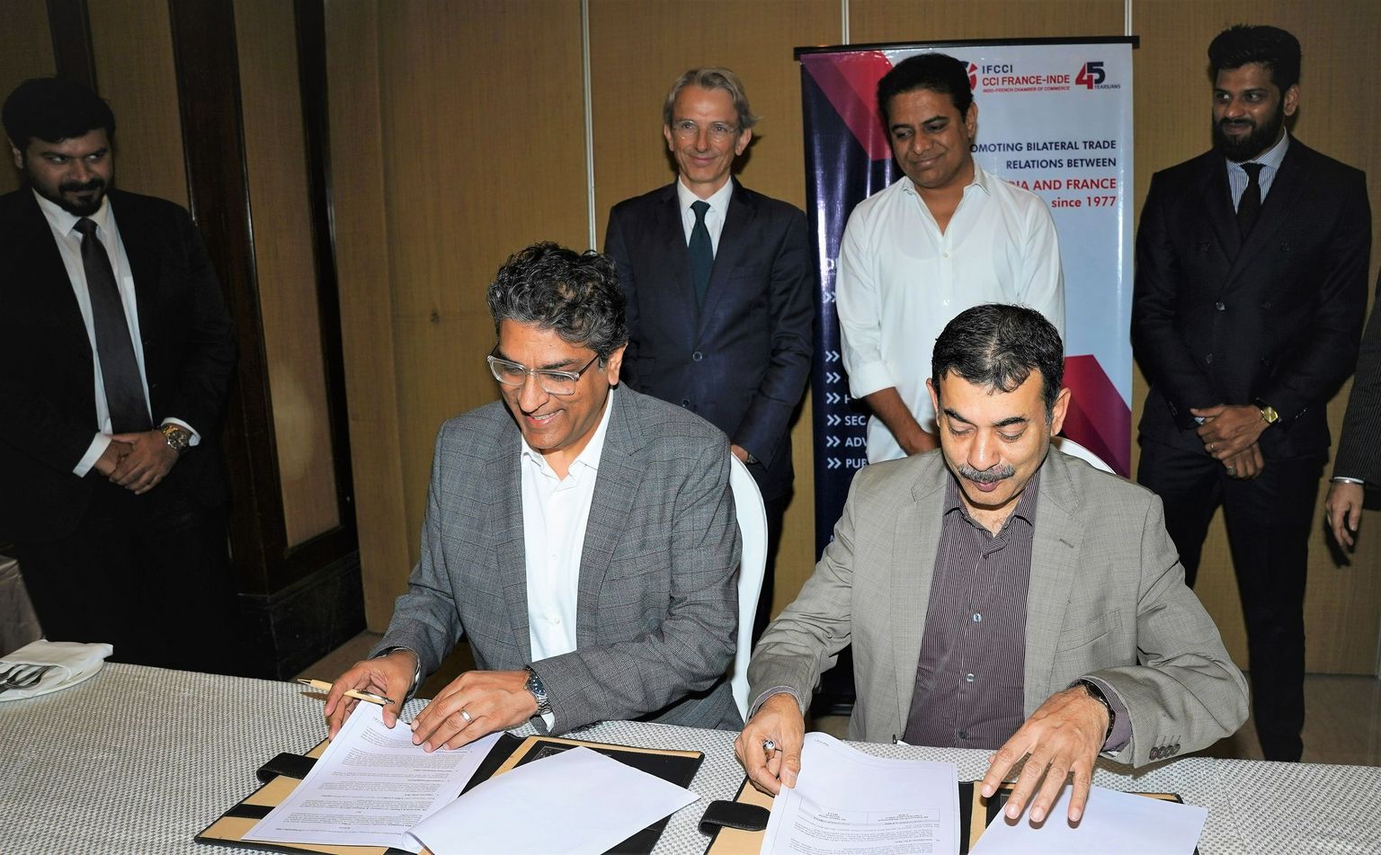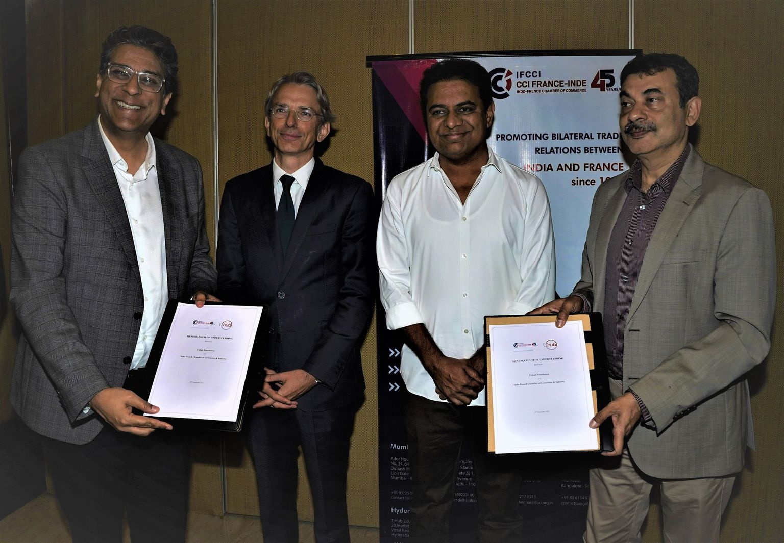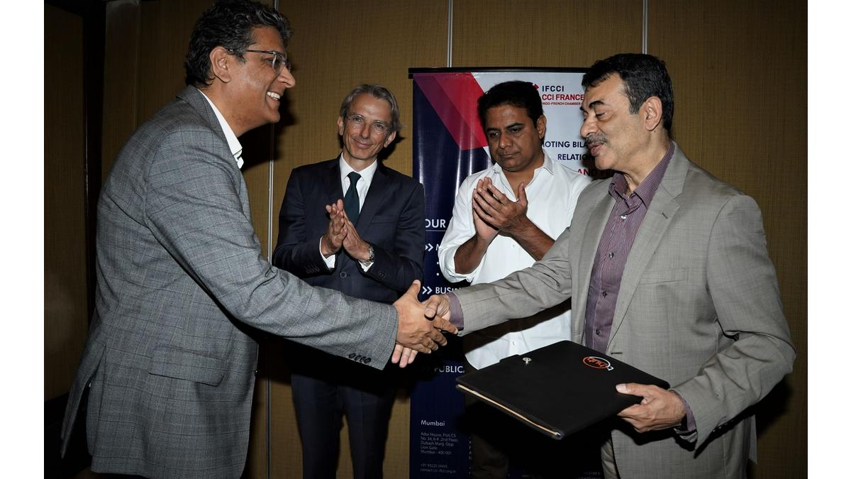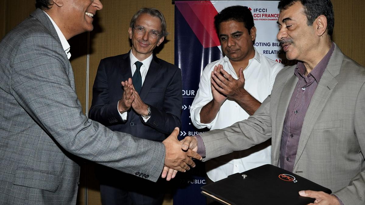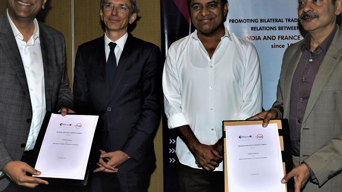 The Indo-French Chamber of Commerce & Industry (IFCCI) signed a memorandum of understanding (MoU) with T-Hub 2.0 on Thursday, 29th September 2022 in the presence of H.E Mr. Emmanuel Lenain, Ambassador of France to India, Mr. KT Rama Rao, Hon’ble Minister of IT, I&C, MA and UD, Govt. of Telangana State and signed by Mr. Sumeet Anand, President of IFCCI and Founder, Indsight Growth Partners and Mr. Jayesh Ranjan, Principal Secretary I&C and IT, Govt. of Telangana State along with Panneerselvam Madanagopal, Chief Innovation Officer of T-Hub.