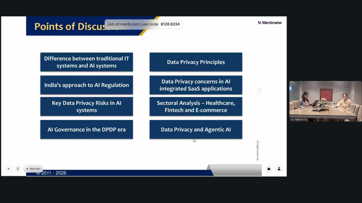 The Indo-French Chamber of Commerce & Industry (IFCCI), in association with S.S. Rana & Co., successfully convened a webinar titled ‘Algorithms under Watch: AI Compliance and Ethics in the DPDP Era’ on 21st January 2026.