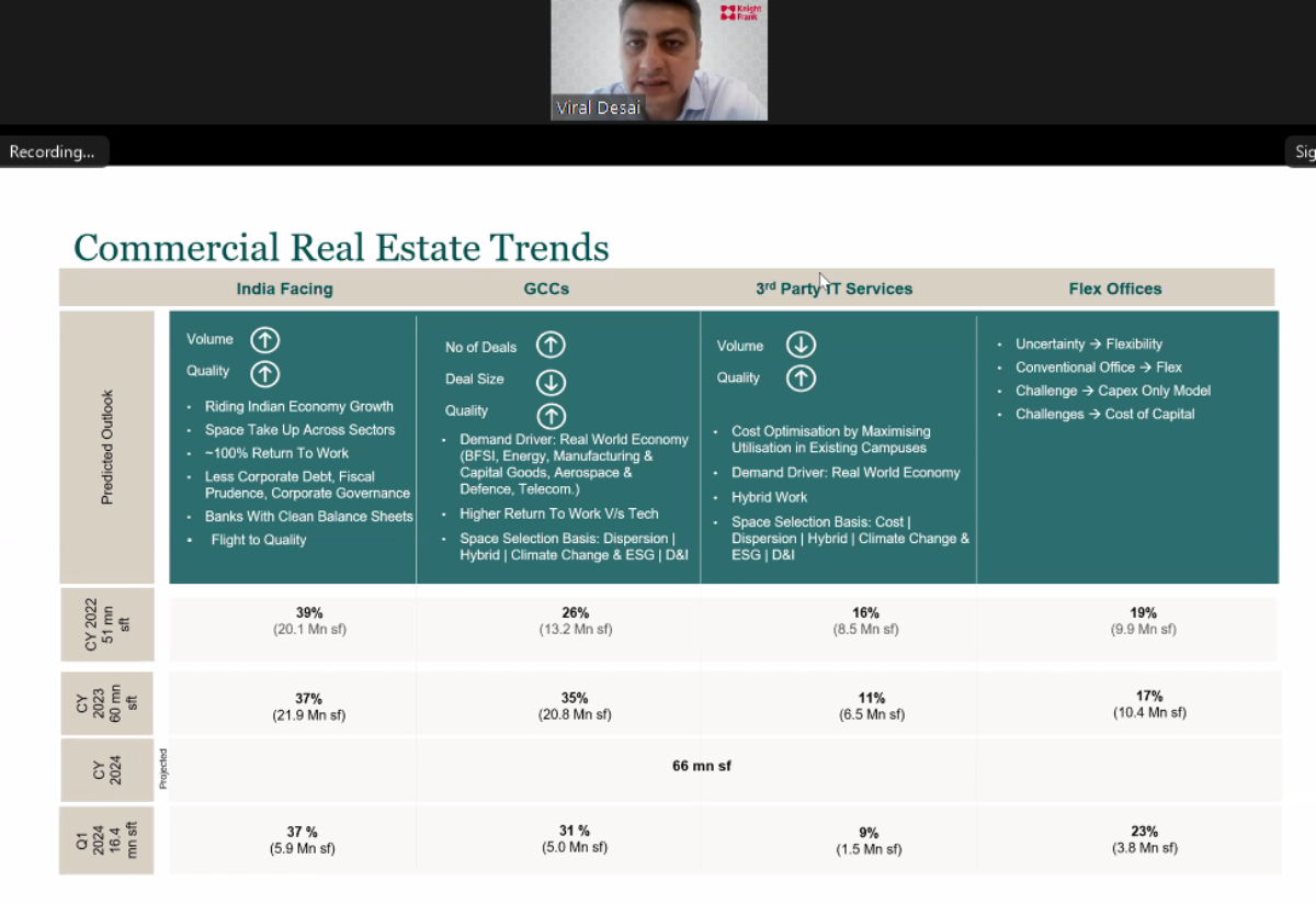 The Indo-French Chamber of Commerce and Industry (IFCCI) Mumbai collaborated with Knight Frank to organize an informative webinar on the Future of Workspaces and Office Leasing Market in India. The webinar began with Ms. Tracy Fernandes, Senior Manager - Events & Membership (WR), welcoming the participants and explaining the relevance of the topic in today’s changing landscape. She also introduced Viral Desai to the attendees. Viral Desai, Senior Executive Director at Knight Frank India, led a presentation on the future of workspaces in India.