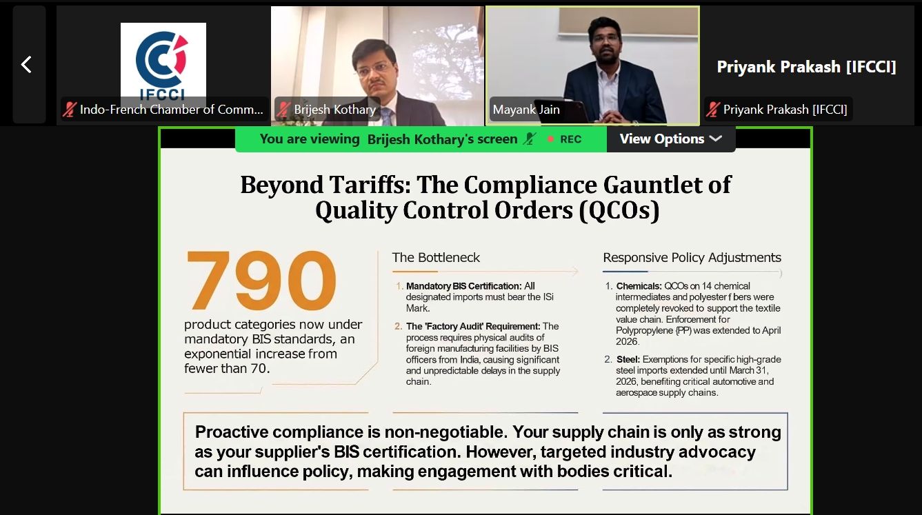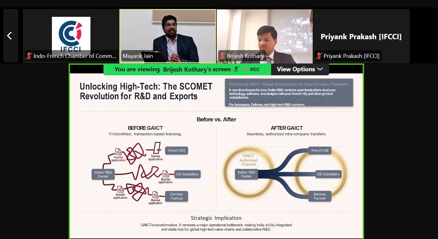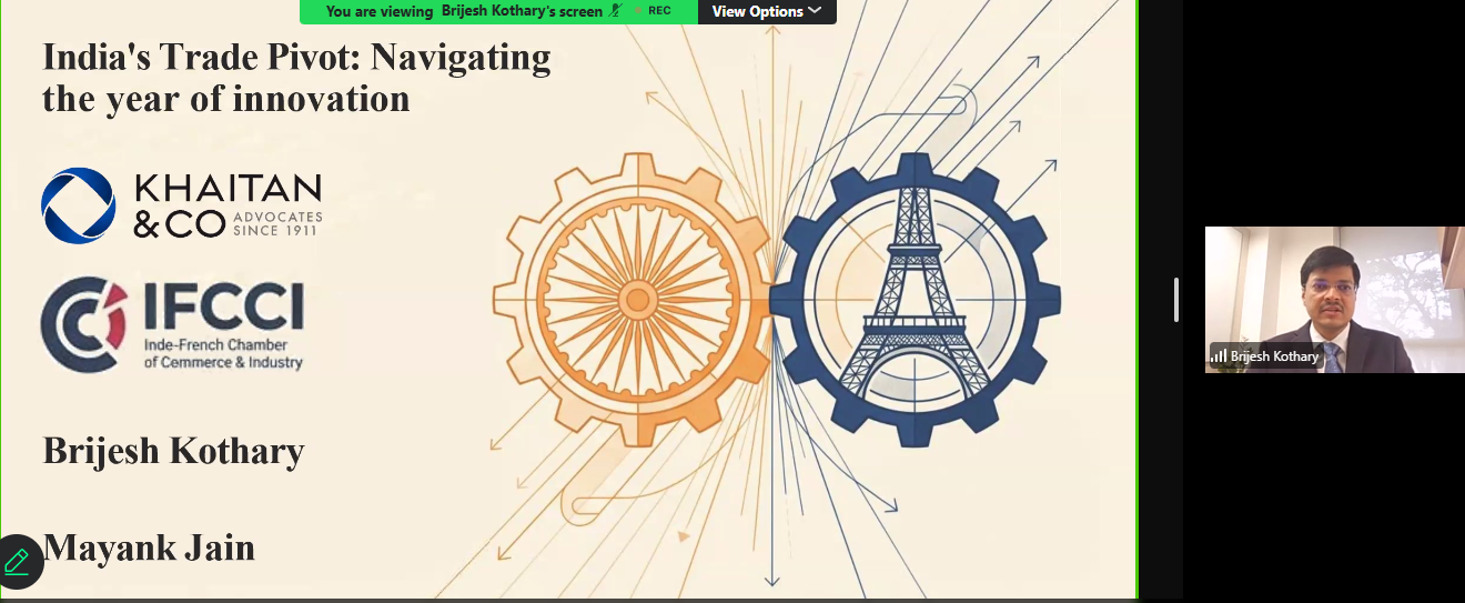 The session was led by Mr. Brijesh Kothary, Partner, and Mr. Mayank Jain, Partner, Khaitan & Co., who delivered an in-depth presentation on India’s trade pivot and navigating the India–France Year of Innovation, highlighting key regulatory shifts impacting cross-border operations.