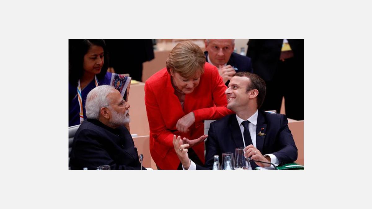 French President Emmanuel Macron talks to German Chancellor Angela Merkel as India’s Prime Minister Narendra Modi listens during the G20 leaders summit in Hamburg, Germany July 7, 2017. REUTERS/Philippe Wojazer