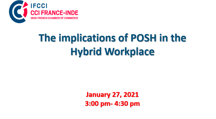 The Indo-French Chamber of Commerce & Industry under the aegis of HR Committee organized a webinar on 'The implications of POSH in the Hybrid Workplace' on January 27, 2021. Our speaker, Sonal Mattoo, Advocate, Helping Hands and Moderator, Shrikant Lonikar,Whole-Time Director & CHRO, Pernod Ricard India discussed about the POSH Policy with help of case studies and practical examples.