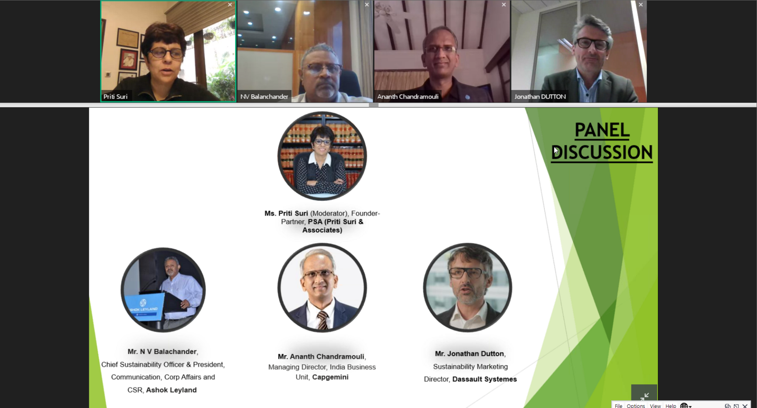 This presentation was followed by an interactive Panel Discussion moderated by Ms. Priti Suri Founder-Partner, PSA (Priti Suri & Associates) along with prominent industry leaders including Mr. Ananth Chandramouli, Managing Director, India Business Unit, Capgemini, Mr. N V Balachander, Chief Sustainability Officer & President