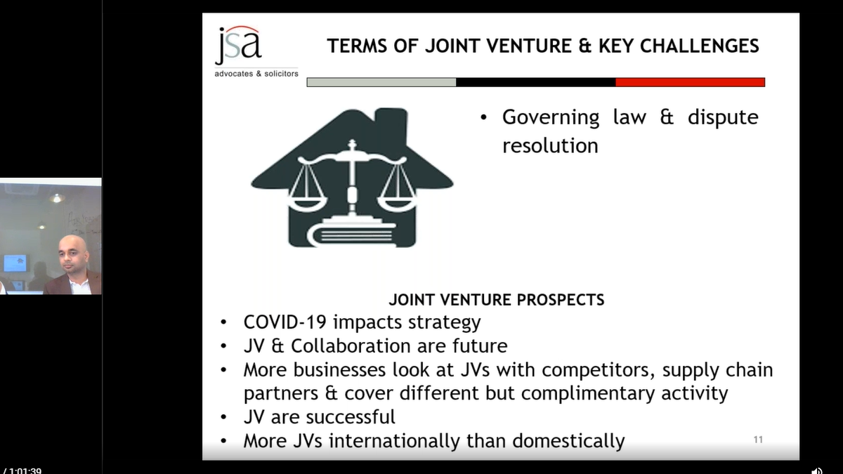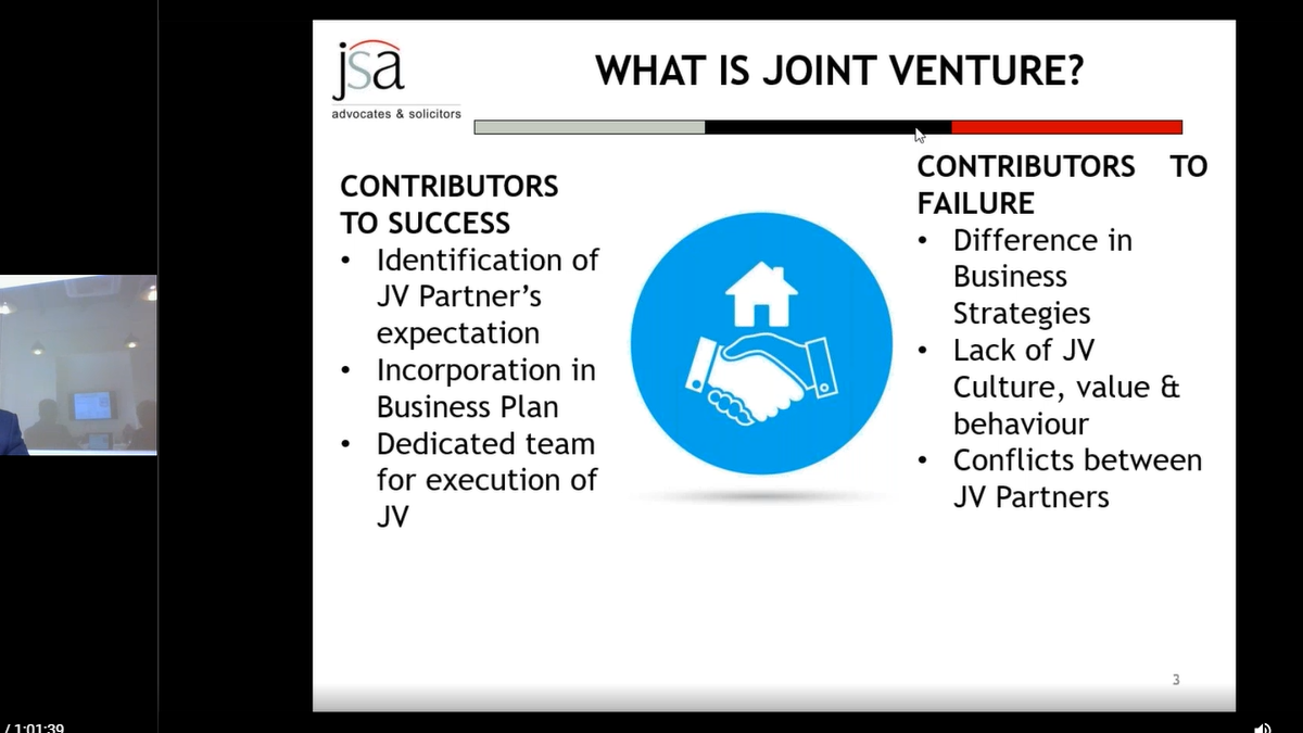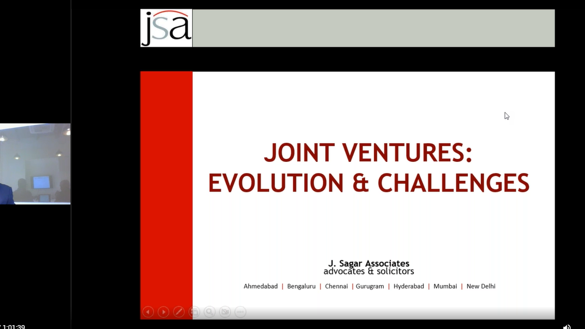 The webinar shed light on the topic on 'Joint venture' . It stated that JV is a business organisation where two or more individual, companies join hands to overcome the individual hurdle and gain a tactical advantage over the competitor in the market. In this session, the speakers: