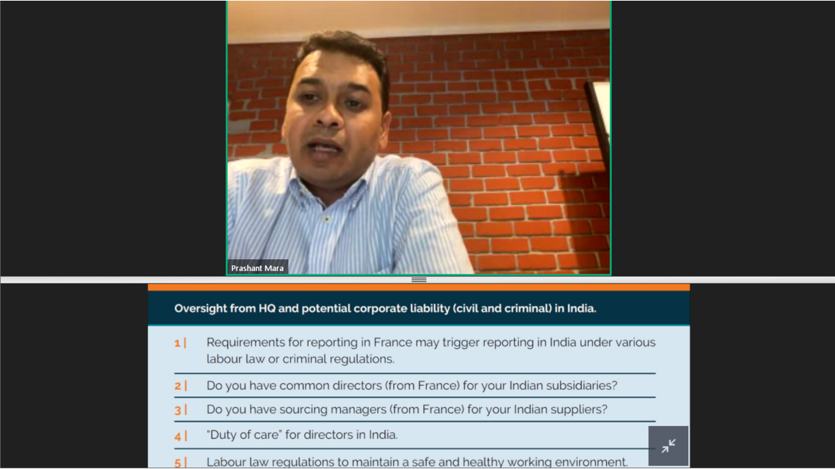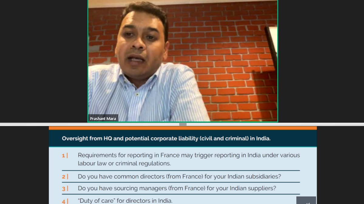 Mr. Prashant Mara, Managing Partner, BTG Legal gave a detailed presentation on the classification of ESG, the global framework, the regulatory/reporting standards in India, ESG values, high risk areas in Indian supply chain, whistle-blower programs and their effectiveness in India, due diligence and investigations, local cultural nuances and the oversight from French HQ and potential corporate liability in India.