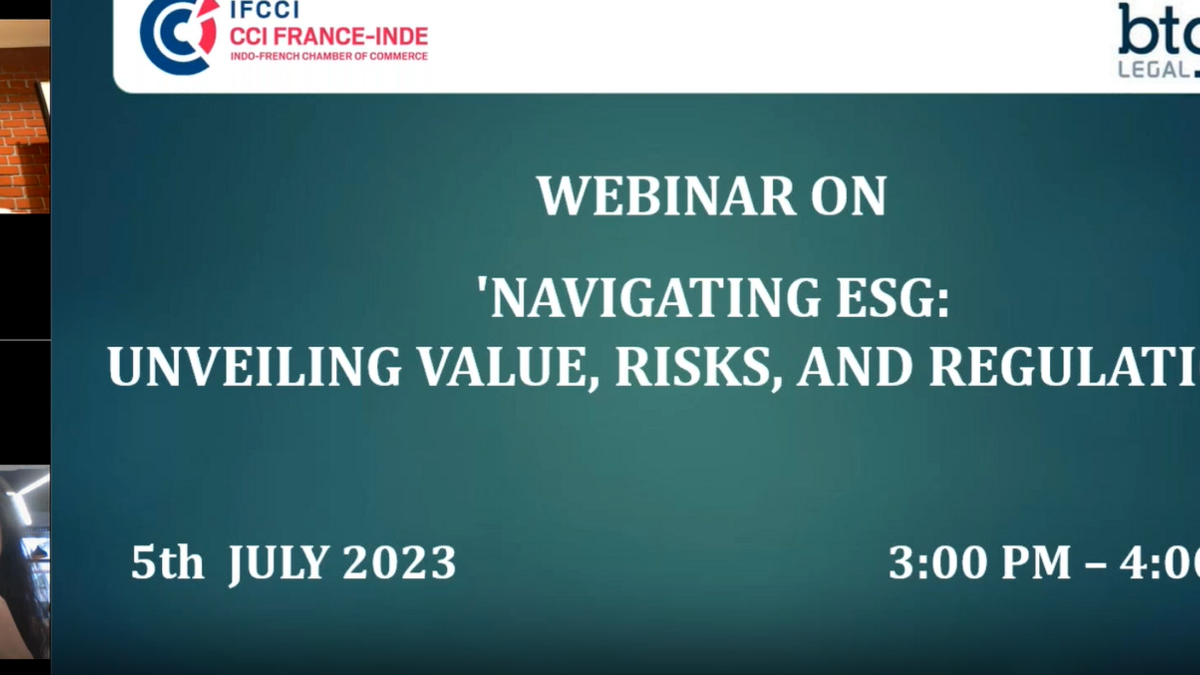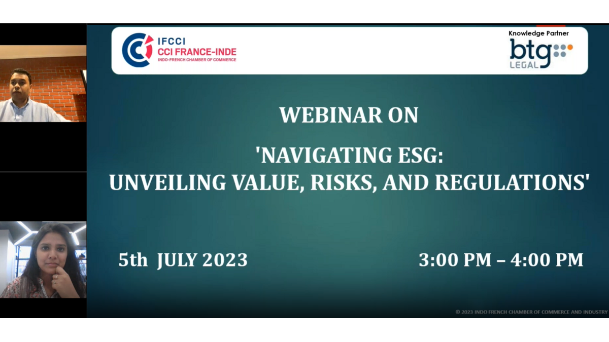 The Indo-French Chamber of Commerce & Industry (IFCCI), under the aegis of its CSR Committee and in association with BTG Legal, organised a Webinar on 'Navigating ESG: Unveiling Value, Risks, and Regulations', on 5th July 2023.