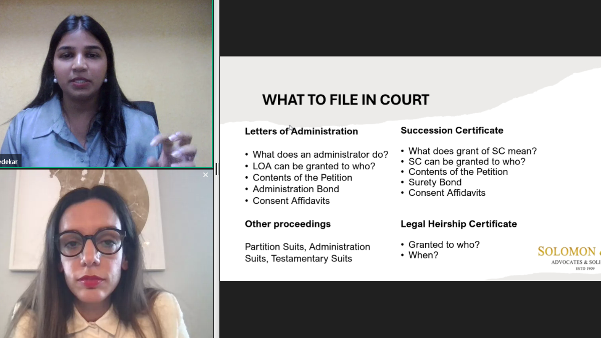 This webinar navigated the legalities and provided a clear understanding of inheritance rights and procedures in India. The participants learnt about testamentary succession, will-making, intestate succession, identification & valuation of assets, considerations for NRIs and legalities needed to know to secure rightful inheritance or prepare for passing on legacy.
