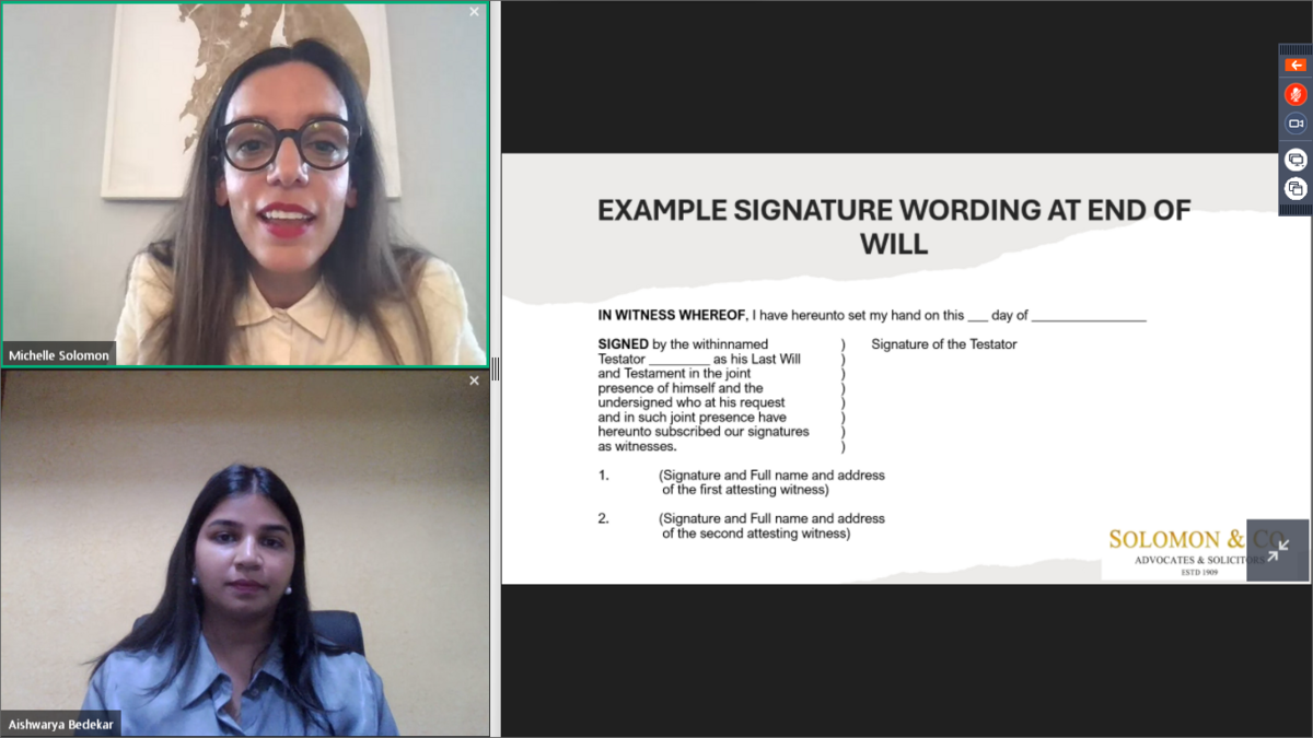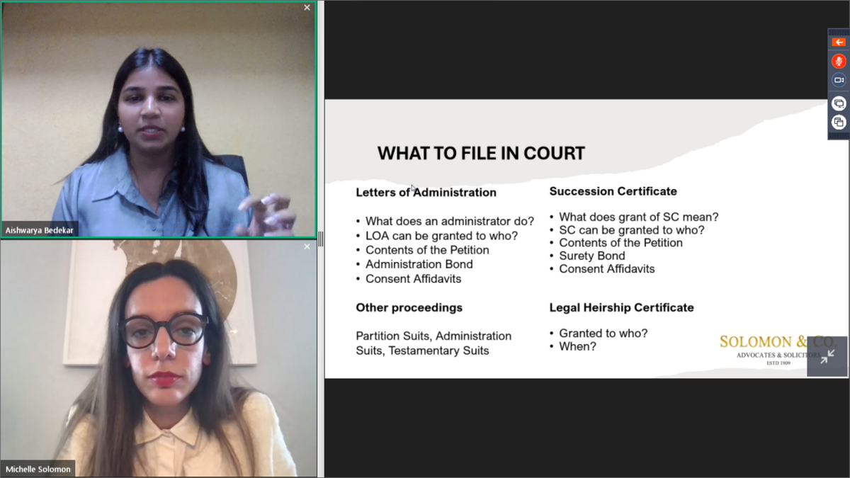 Ms. Aishwarya Bedekar, Senior Associate, Solomon & Co., presented the details of Intestate Succession. The details of the Hindu Laws, Mohammedan Laws, Christian Laws, and Parsi Laws of Intestate Succession were explained in detail. Further to this, details of movable, immovable property, key points to keep in mind while approaching an advocate were also discussed with examples. This was followed by an engaging question and answer session with the participants.