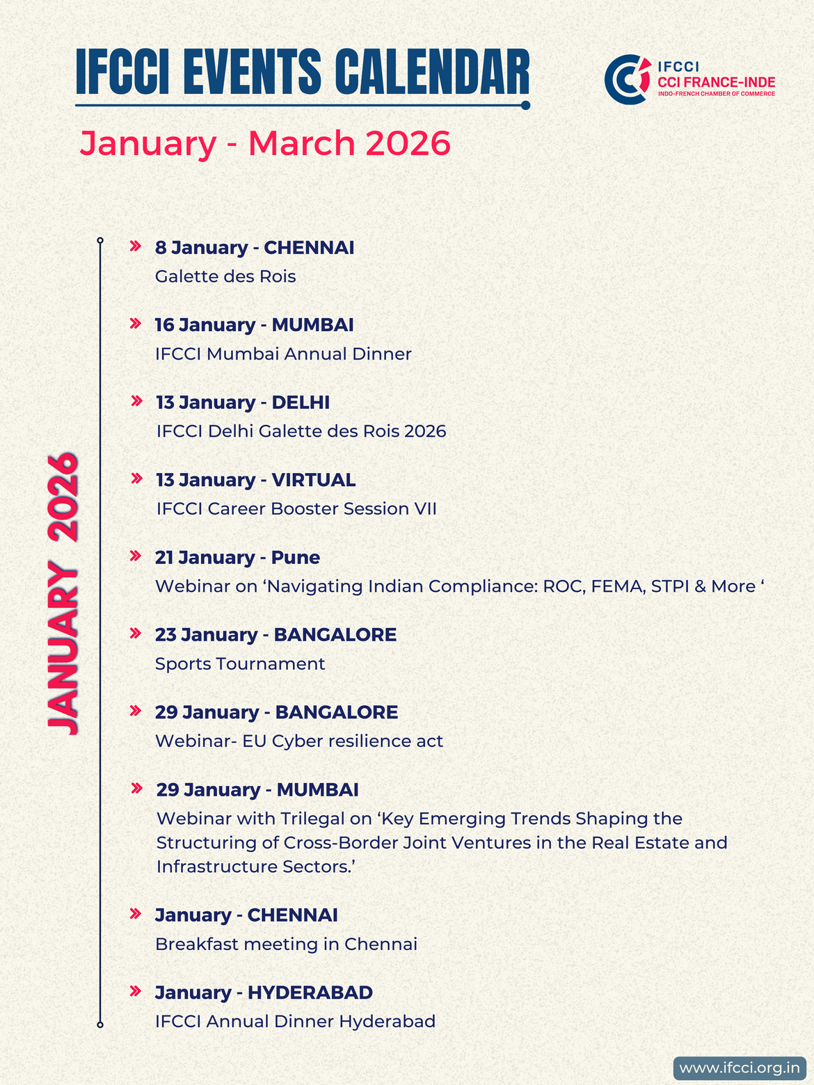 The Indo-French Chamber of Commerce and Industry in India is glad to share with you the JANUARY - March 2026 events calendar.
