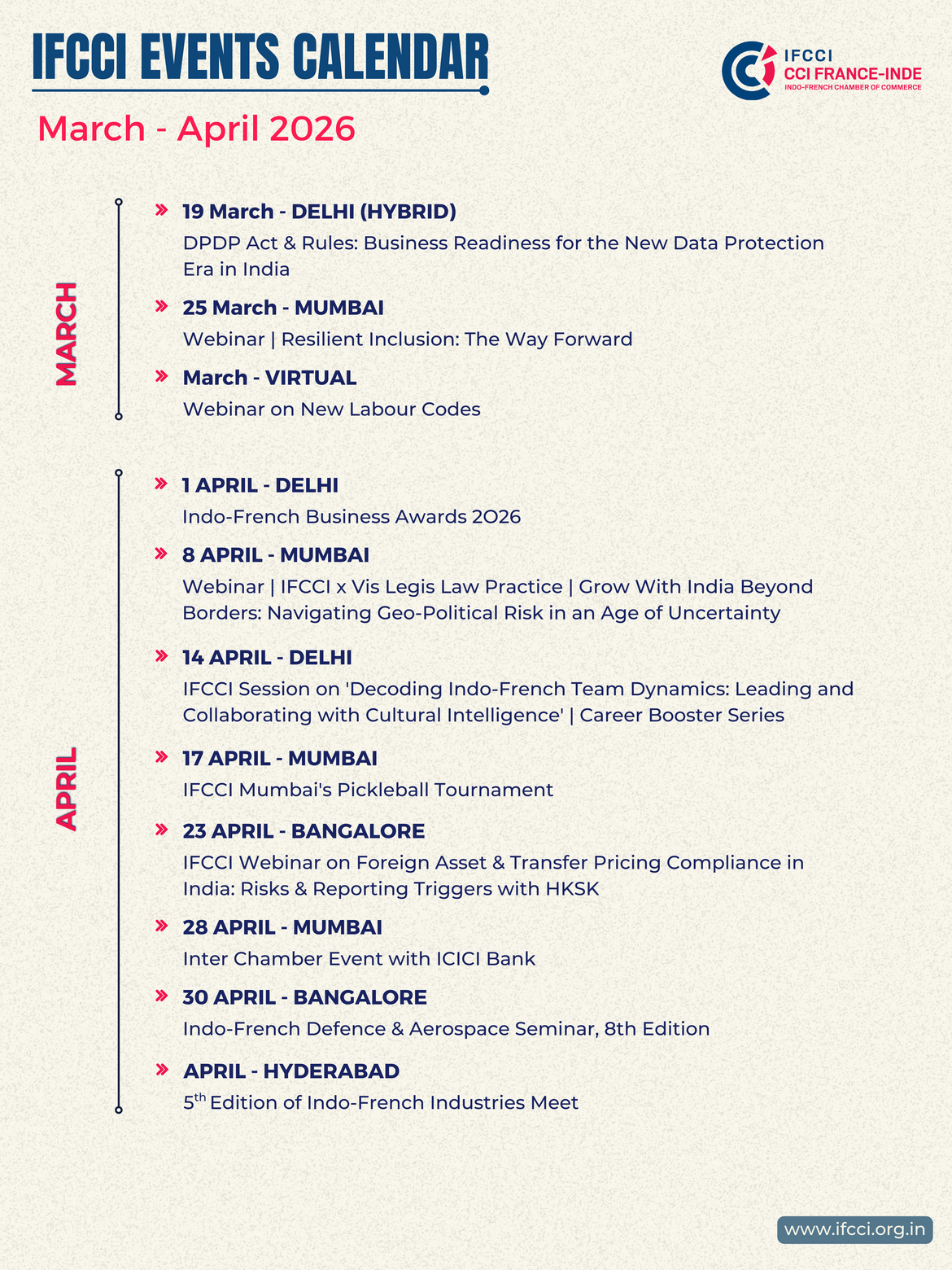 The Indo-French Chamber of Commerce and Industry in India is glad to share with you the March - April 2026 events calendar.