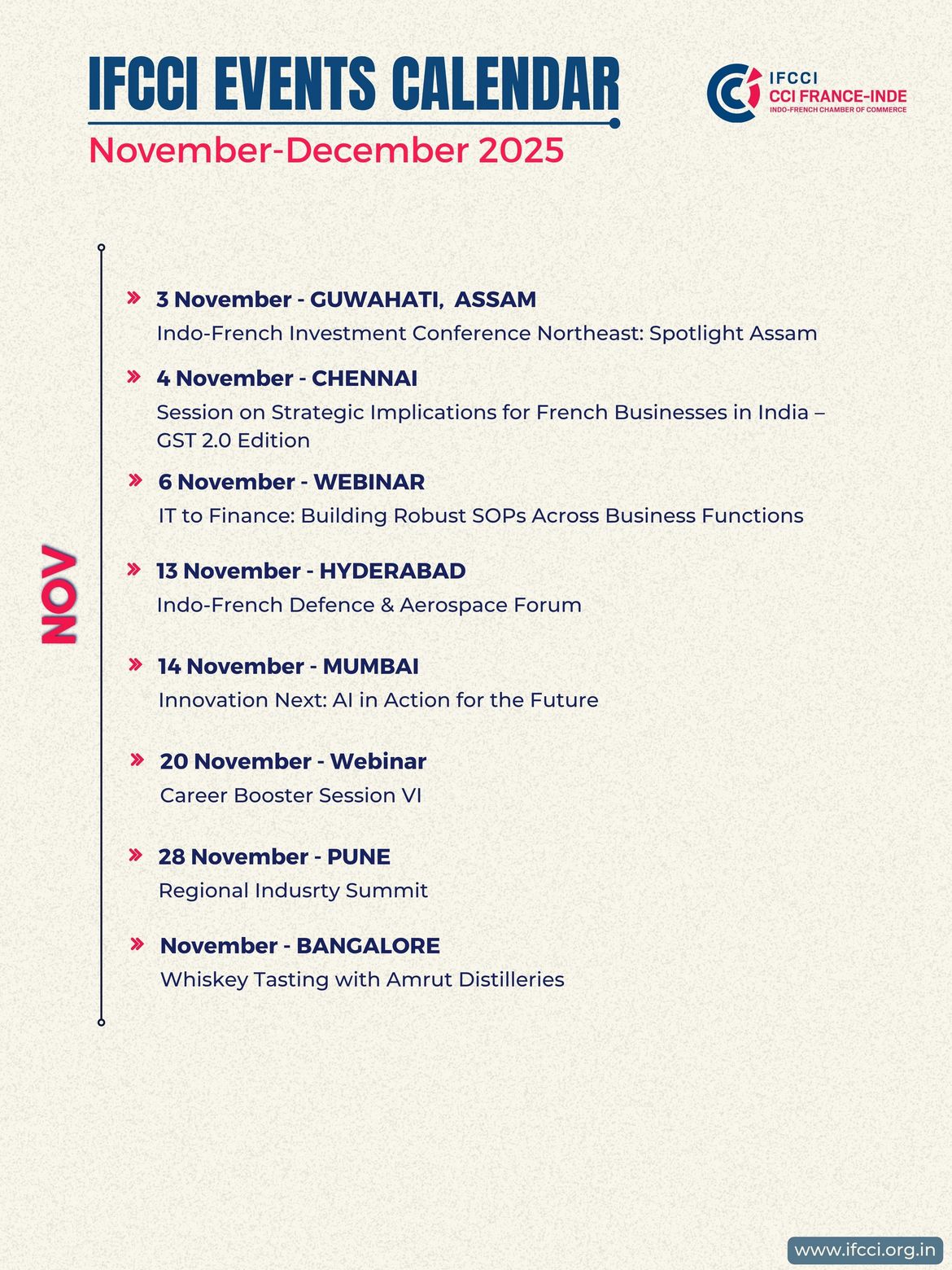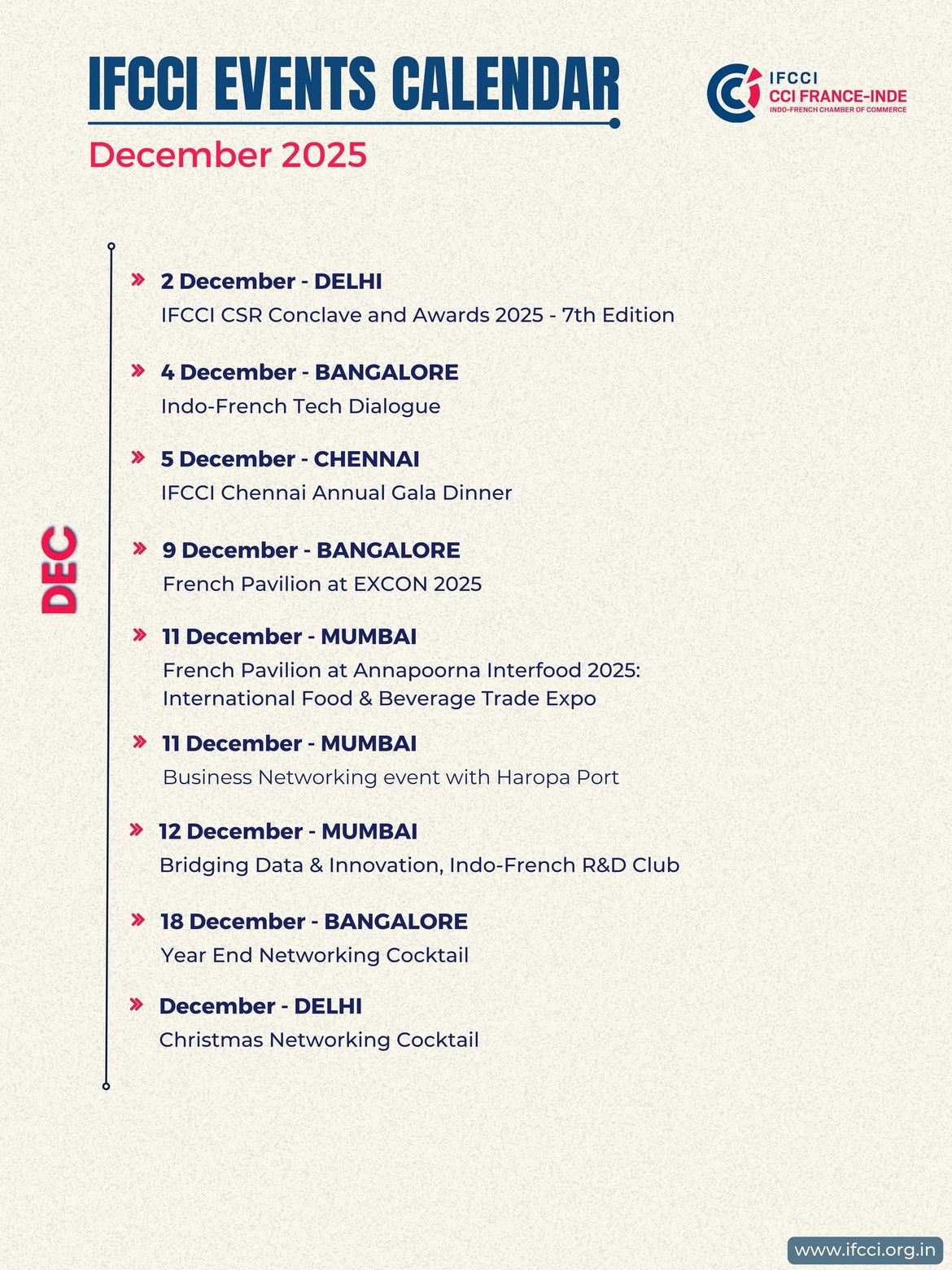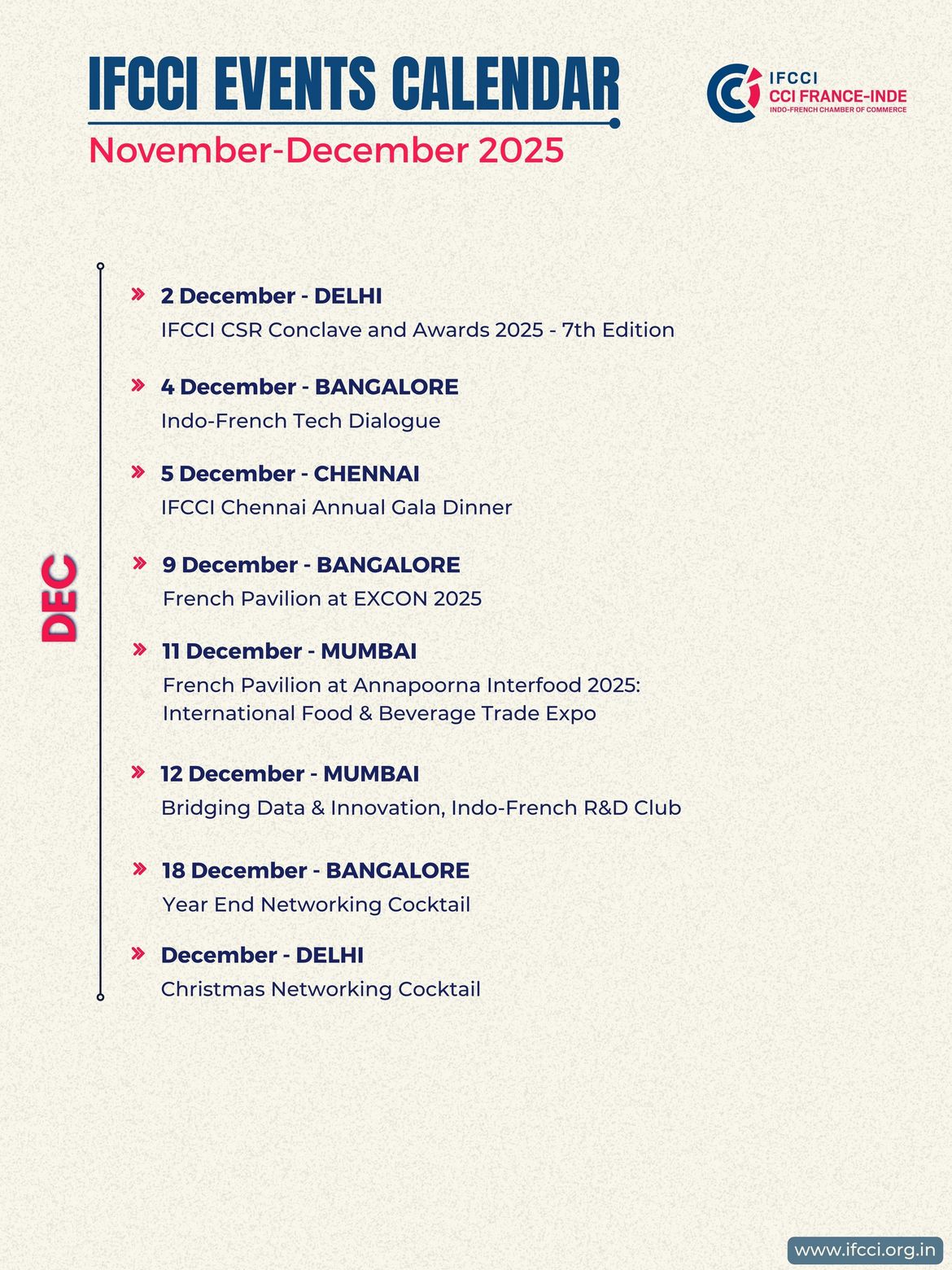 The Indo-French Chamber of Commerce and Industry in India is glad to share with you the November - December 2025 events calendar.