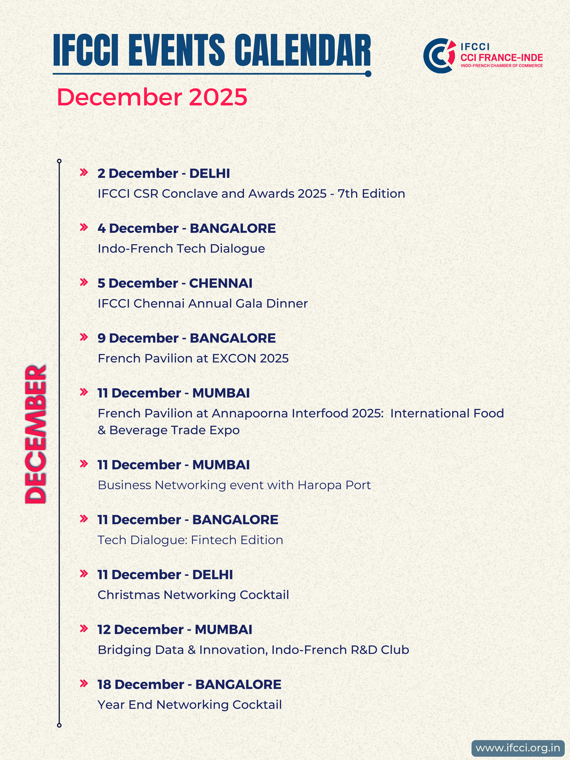 The Indo-French Chamber of Commerce and Industry in India is glad to share with you the December 2025 - March 2026 events calendar.