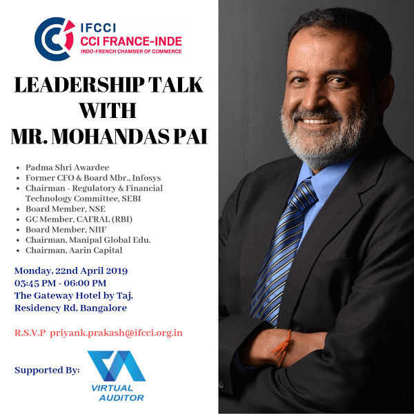 The Indo French Chamber of Commerce and Industry (IFCCI) in Bangalore supported by its member, Virtual Auditor is organizing for the first time, a highly exclusive closed-door Leadership talk with Mr. Mohandas Pai with the objective to give insights to the Indo-French business community on: