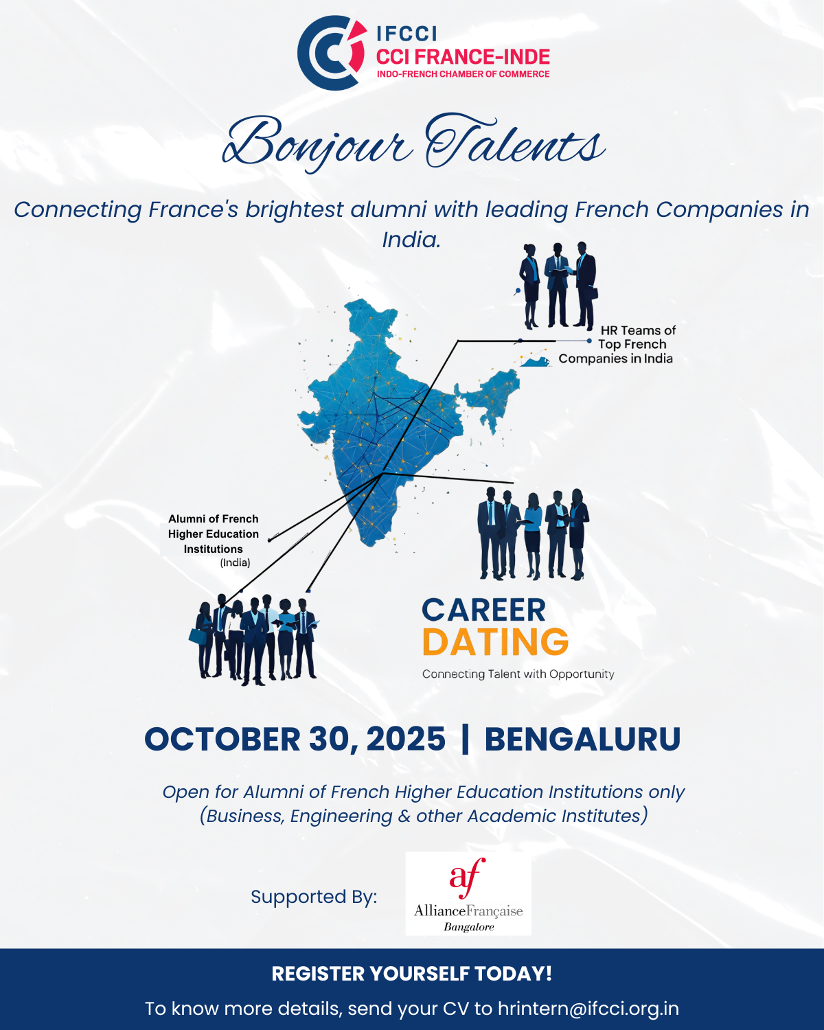 Indo-French Chamber of Commerce & Industry (IFCCI) is thrilled to organise the first edition Bonjour Talents in Bangalore, an innovative initiative designed to bring together the French-educated Alumni and the top French companies in India under one roof.