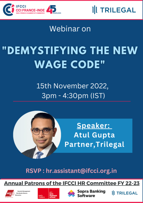 IFCCI HR Committee in association with TRILEGAL invites you to a webinar on “DEMYSTIFYING THE NEW WAGE CODE”. The webinar will be held on Tuesday, 15 th November 2022 from 3.00 to 4.30 pm