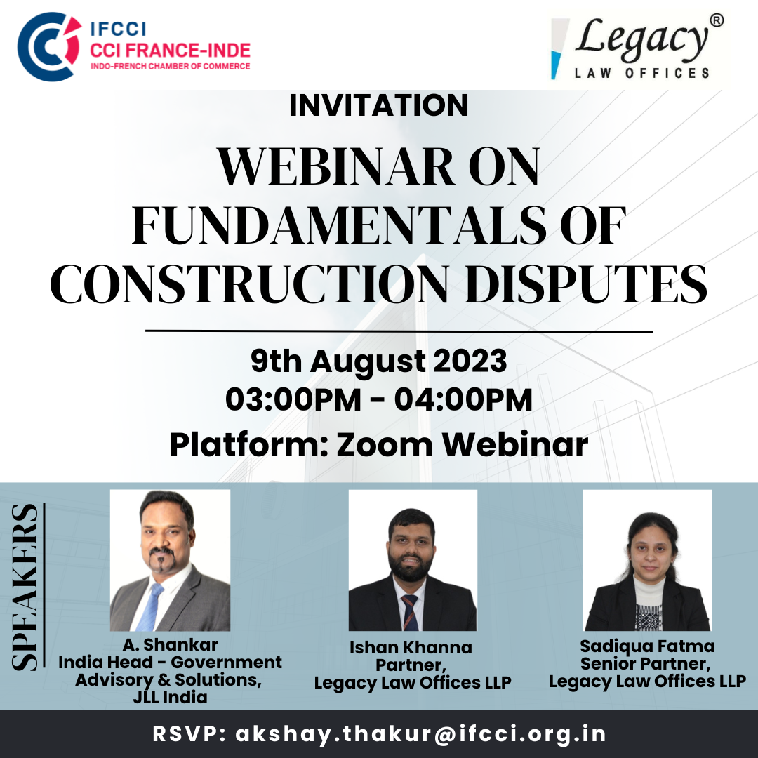 IFCCI under the aegis of its Industries Committee is organizing a webinar on Fundamentals of Construction Disputes with Legacy Law on 9th Aug 2023.