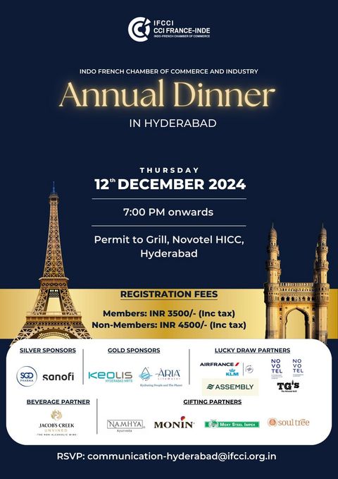 The Indo-French Chamber of Commerce and Industry (IFCCI) invites you to the IFCCI Annual Dinner 2024 on Thursday, 12th December in Hyderabad!