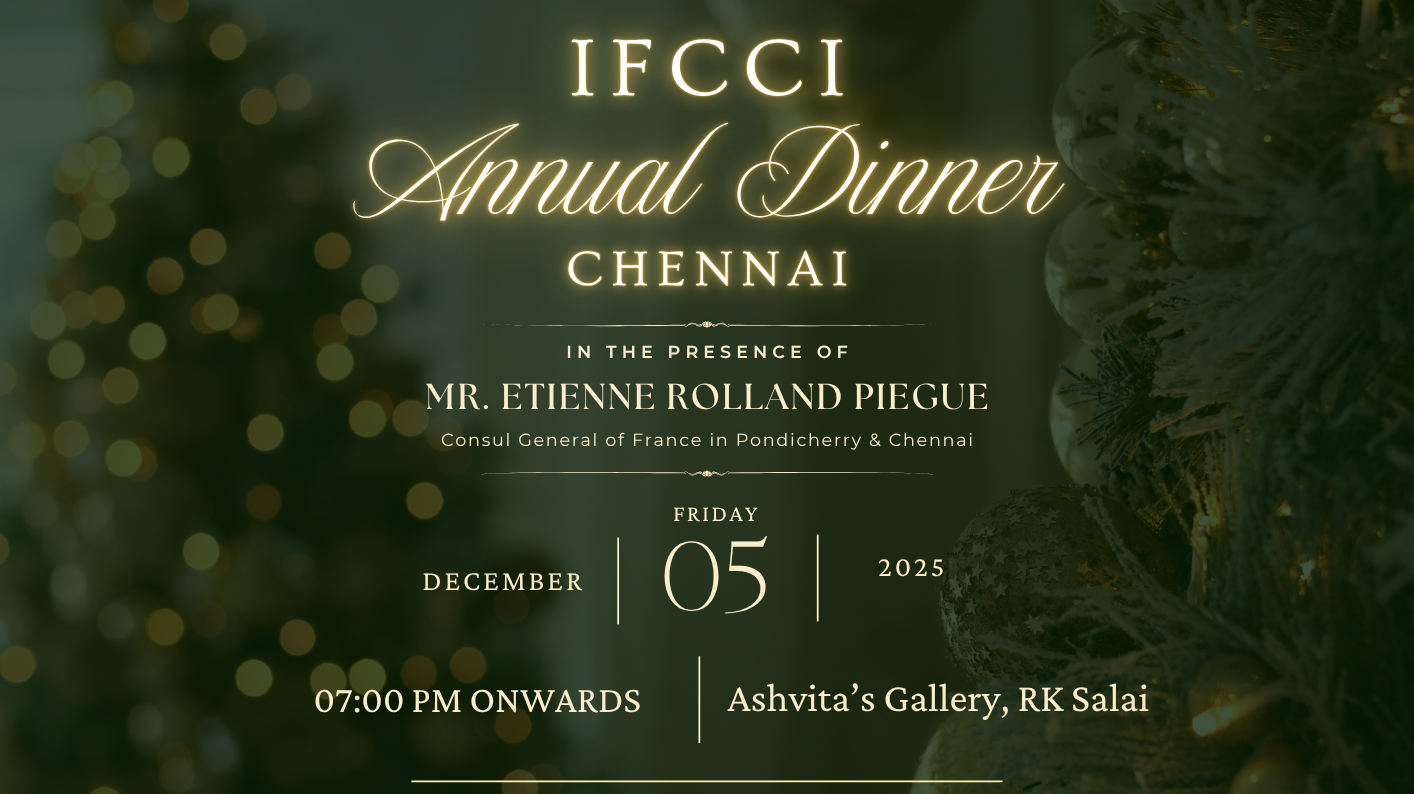 The Indo-French Chamber of Commerce & Industry (IFCCI) is pleased to announce the most anticipated networking event of 2025, the IFCCI Chennai Annual Dinner, to be held on Friday, 5th December 2025 at Ashvita’s Art Gallery, RK Salai, Chennai, from 7:00 PM onwards.