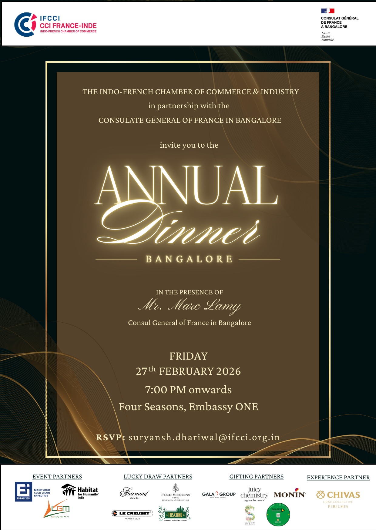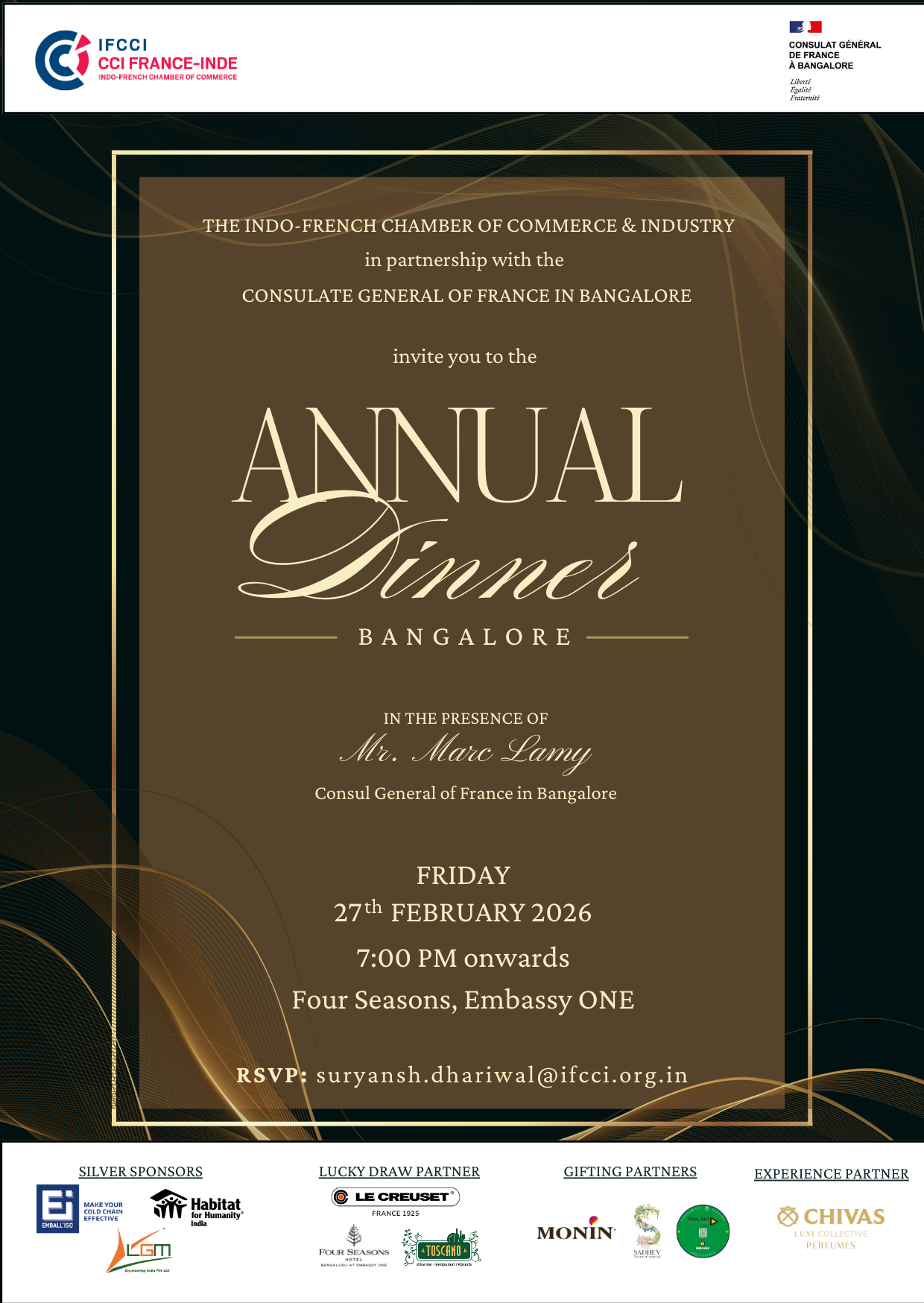 The Indo-French Chamber of Commerce & Industry (IFCCI), in partnership with the Consulate General of France in Bangalore, is pleased to host its premier networking event, the IFCCI Annual Dinner, at the Four Seasons, Bangalore.