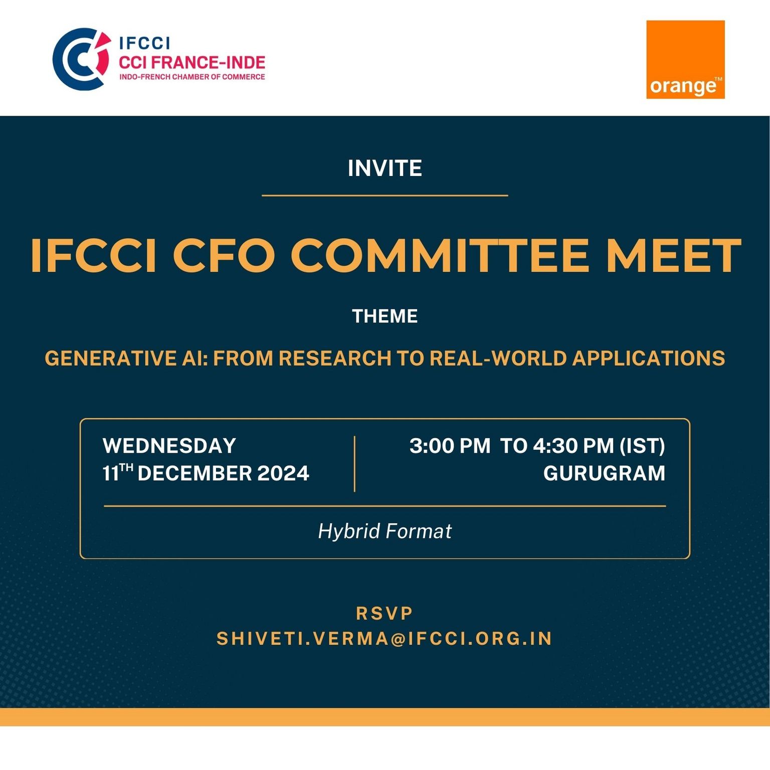 The Indo-French Chamber of Commerce & Industry (IFCCI), in collaboration with Orange Business Services, is pleased to invite you to the CFO Committee Meet on the theme, "Generative AI: From Research to Real-World Applications" on Wednesday, 11th December 2024, from 3:00 PM to 4:30 PM IST in Gurugram.