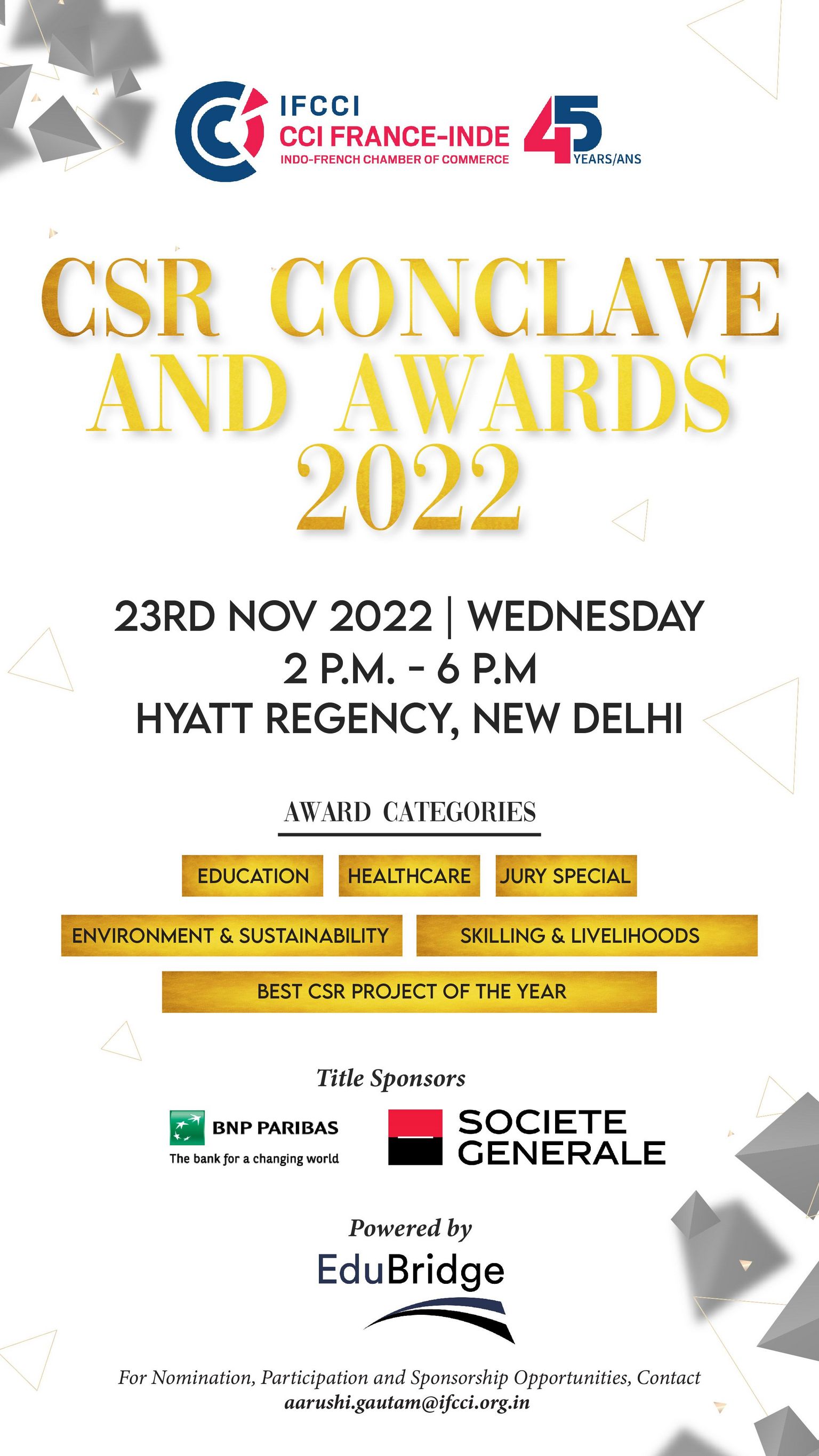 Indo-French Chamber of Commerce & Industry is organizing the fourth edition of its flagship CSR Conclave and Award on Wednesday, 23rd November 2022.