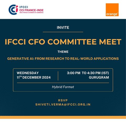 The Indo-French Chamber of Commerce & Industry (IFCCI), in collaboration with Orange Business Services, is pleased to invite you to the CFO Committee Meet on the theme, "Generative AI: From Research to Real-World Applications" on Wednesday, 11th December 2024, from 3:00 PM to 4:30 PM IST in Gurugram.