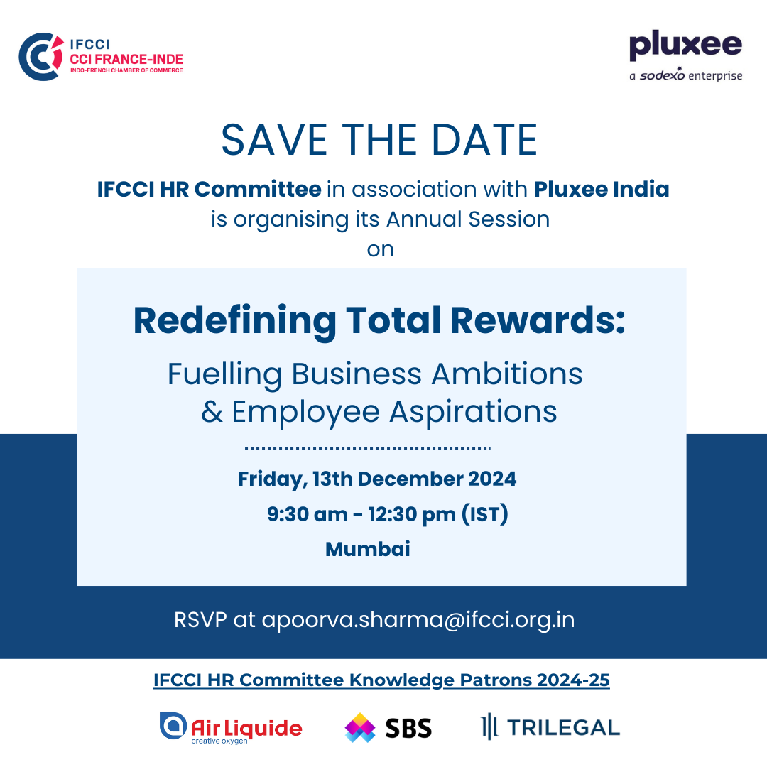 Indo-French Chamber of Commerce & Industry (IFCCI), under the aegis of its HR Committee, in association with Pluxee India, is organising its annual session on Total Rewards on the topic, Redefining Total Rewards: Fuelling Business Ambitions & Employee Aspirations, on Friday, 13th December2024 from 9:30 am to 12:30 pm in a hybrid format in Mumbai.