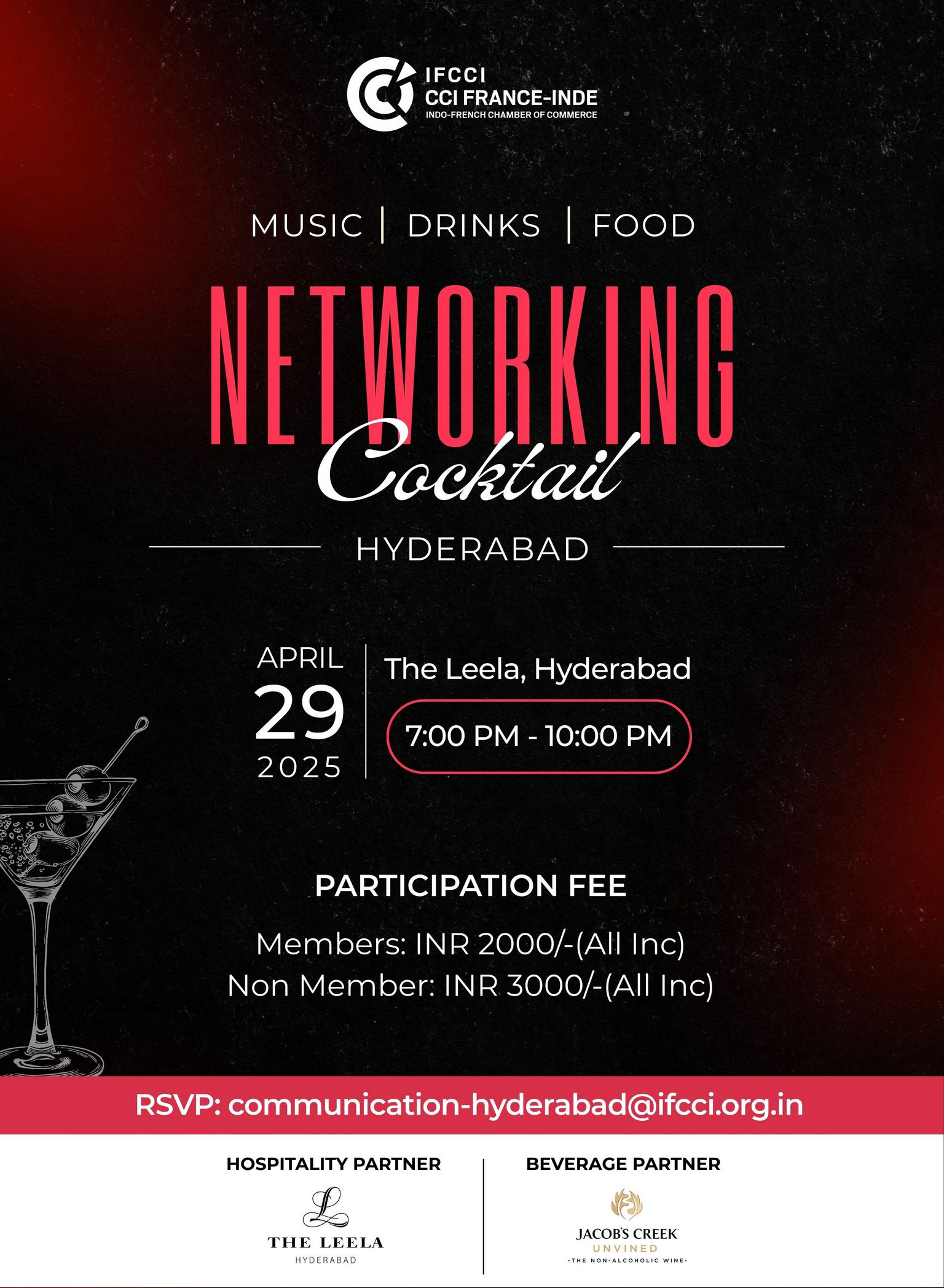 IFCCI, in collaboration with The Leela Hyderabad is delighted to invite you to the IFCCI Hyderabad Networking Cocktail – an evening of great conversations, delightful cocktails, and exclusive networking with CXOs, industry leaders, and key stakeholders from the Indo-French business community.