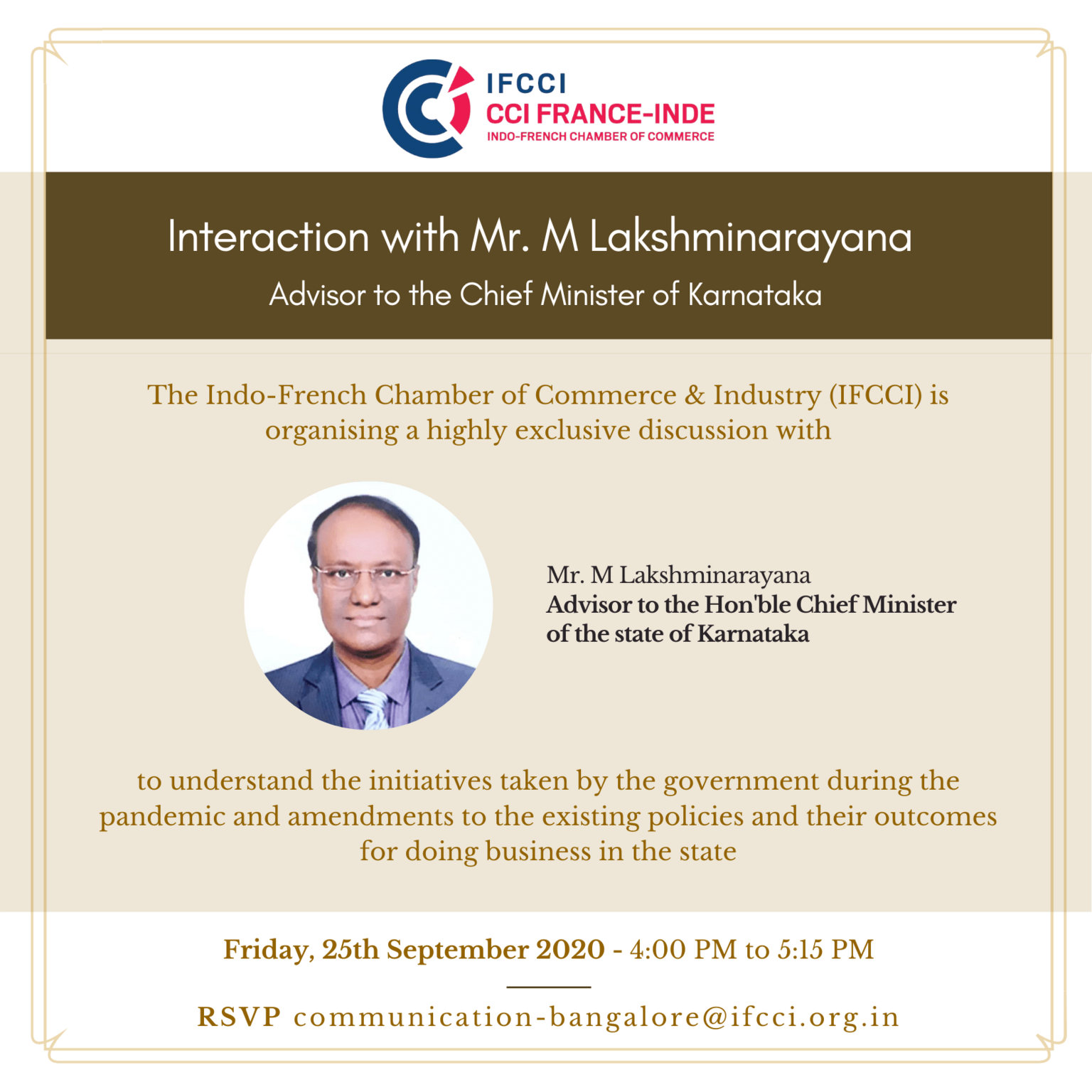 IFCCI is organising a highly exclusive webinar with Mr. M Lakshminarayana, Advisor to the Hon’ble Chief Minister of Karnataka