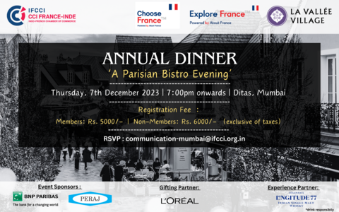 The Indo-French Chamber of Commerce and Industry (IFCCI) is organizing its biggest networking event - Annual dinner in Mumbai on Wednesday, 7th December 2023 at Ditas, World Crest Ground Floor, Lodha, 402, Senapati Bapat Marg, Mumbai, Maharashtra 400013 from 7.00 PM onwards.