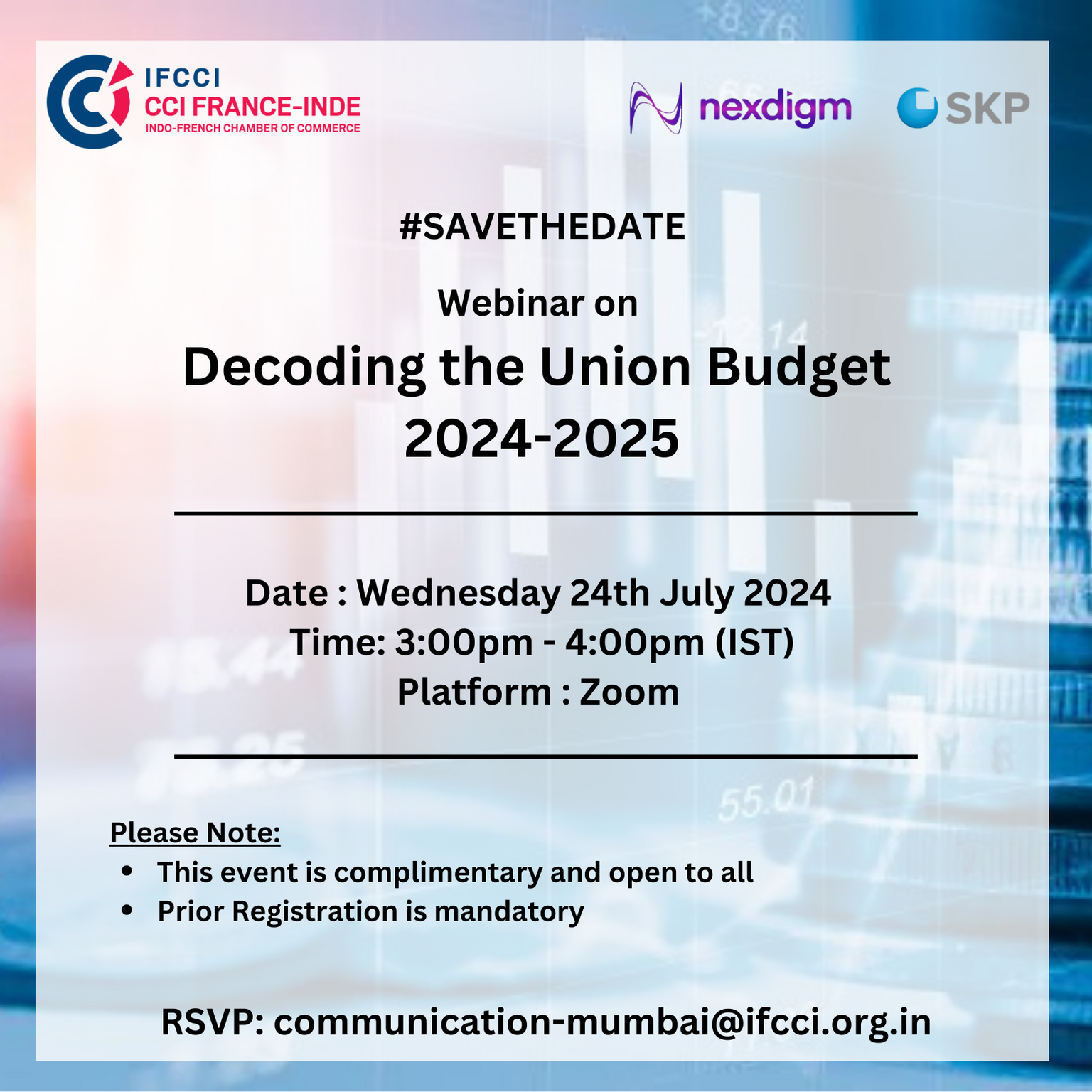 Indo-French Chamber of Commerce & Industry (IFCCI)Mumbai is organizing a webinar on the topic 'Decoding the Union Budget 2024-2025'in association with Nexdigm on Wednesday, 24th July 2024.