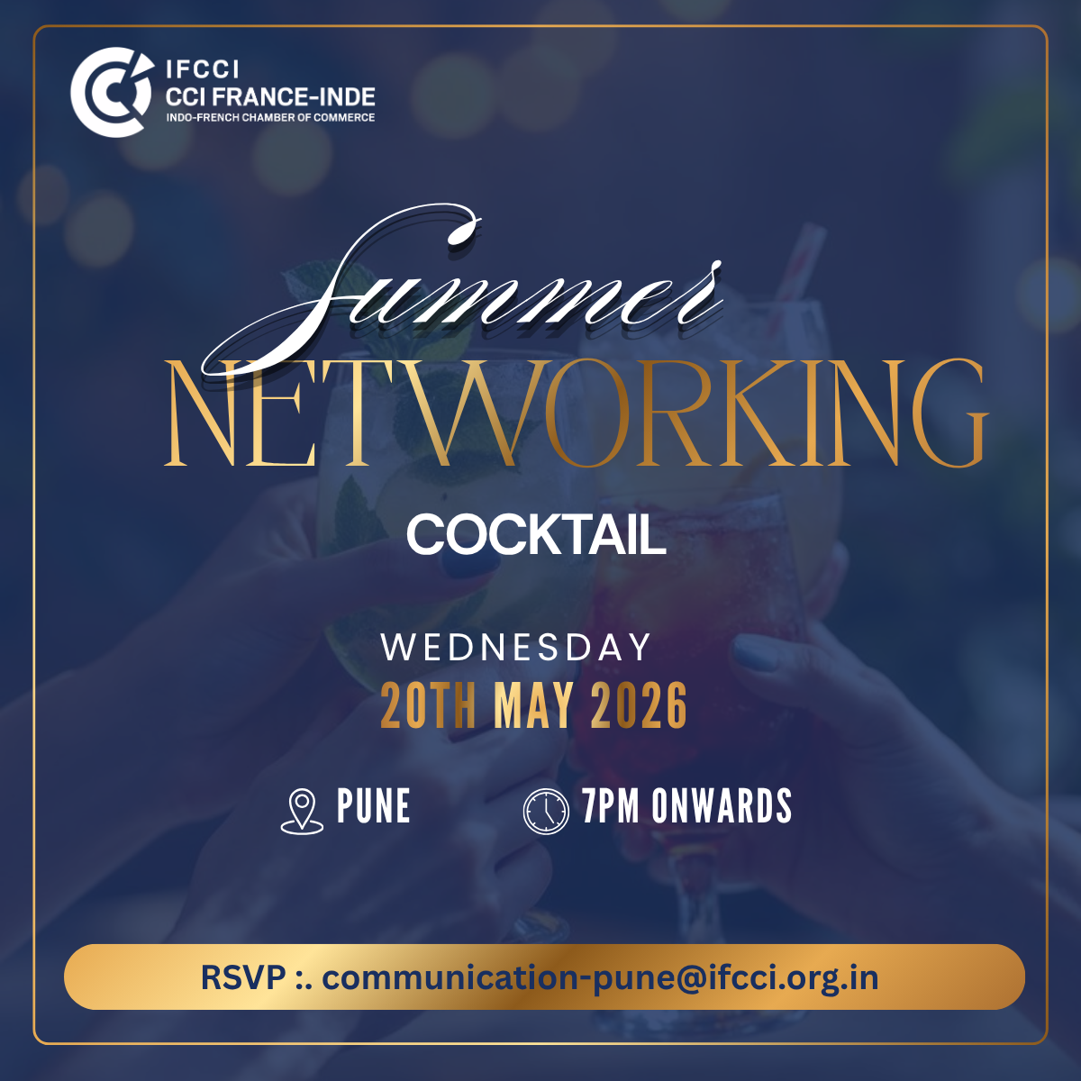 The Indo-French Chamber of Commerce and Industry (IFCCI), Pune Chapter, is delighted to invite you to its Summer Networking Cocktail—an exclusive evening designed to foster insightful interactions, build valuable relationships, and enjoy delightful refreshments.