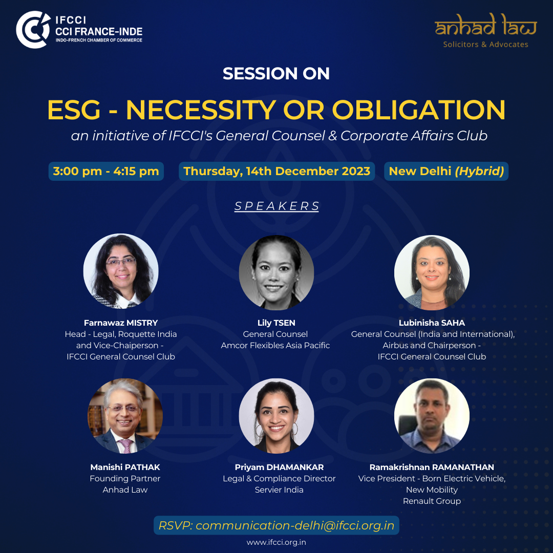 IFCCI General Counsel & Corporate Affairs Club, in association with Anhad Law, is organising a Session on ESG - Necessity or Obligation, on 14 Dec'23.