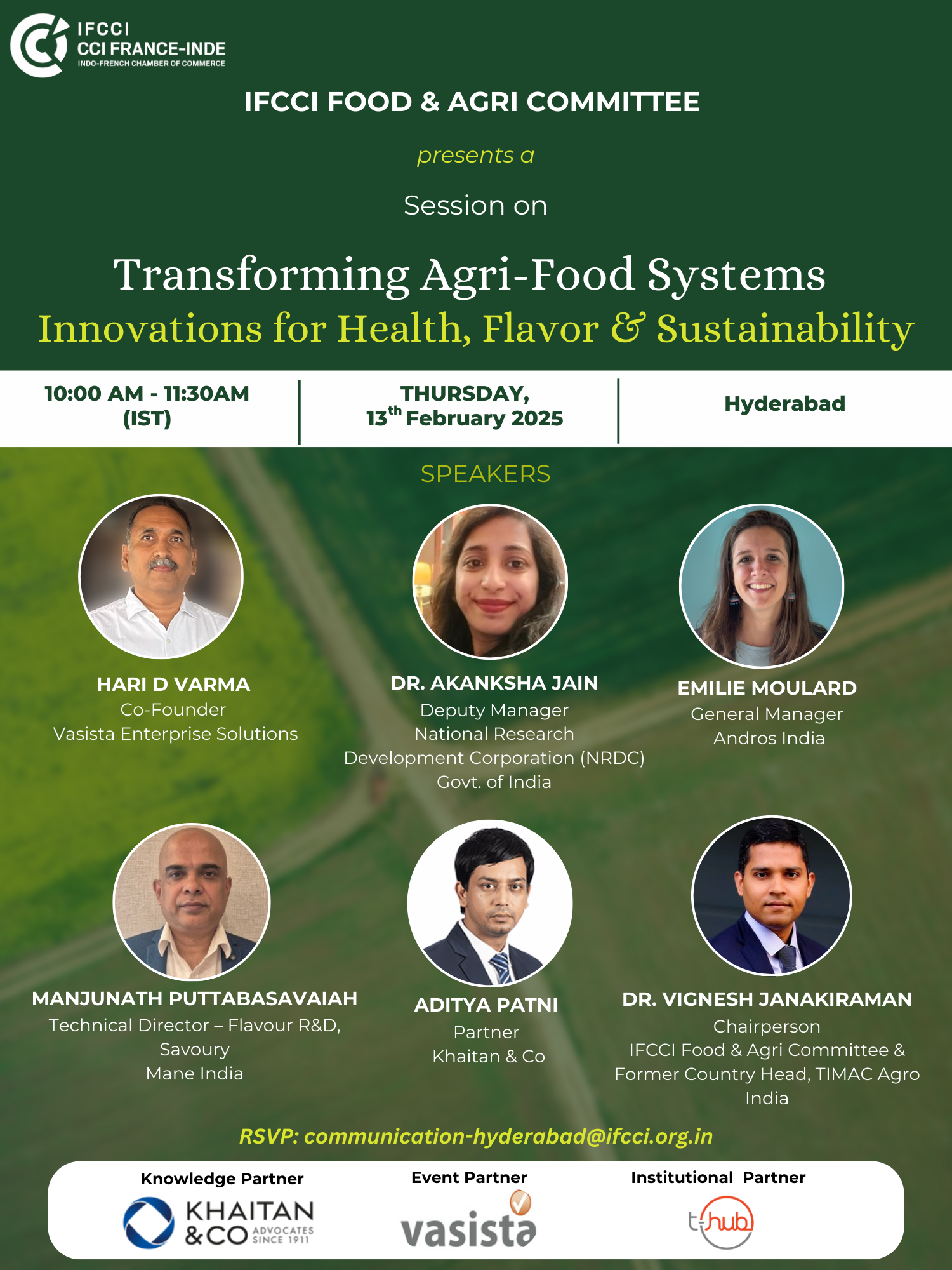 We are delighted to invite you to the IFCCI Hybrid Session on Transforming Agri-Food Systems: Innovations for Health, Flavor, and Sustainability, organized under the aegis of our Food & Agri Committee. This exclusive session will take place on Thursday, 13th February 2025, at T-Hub, Hyderabad.