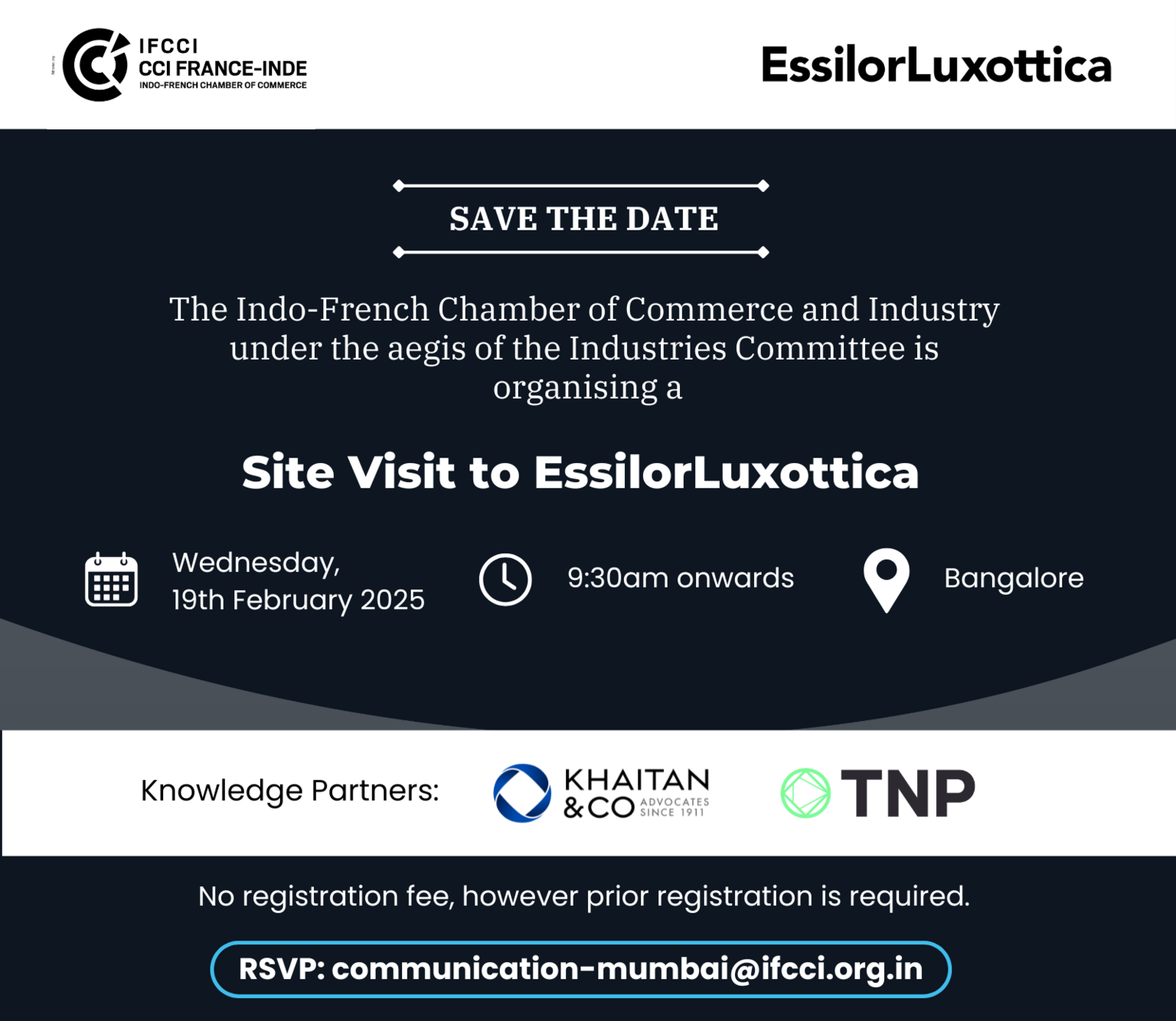 The Indo-French Chamber of Commerce and Industry (IFCCI) under the aegis of the Industries Committee is organising a Site Visit to EssilorLuxottica Pvt. Ltd. on Wednesday, 19th February 2025 from 9:30am onwards at Bangalore