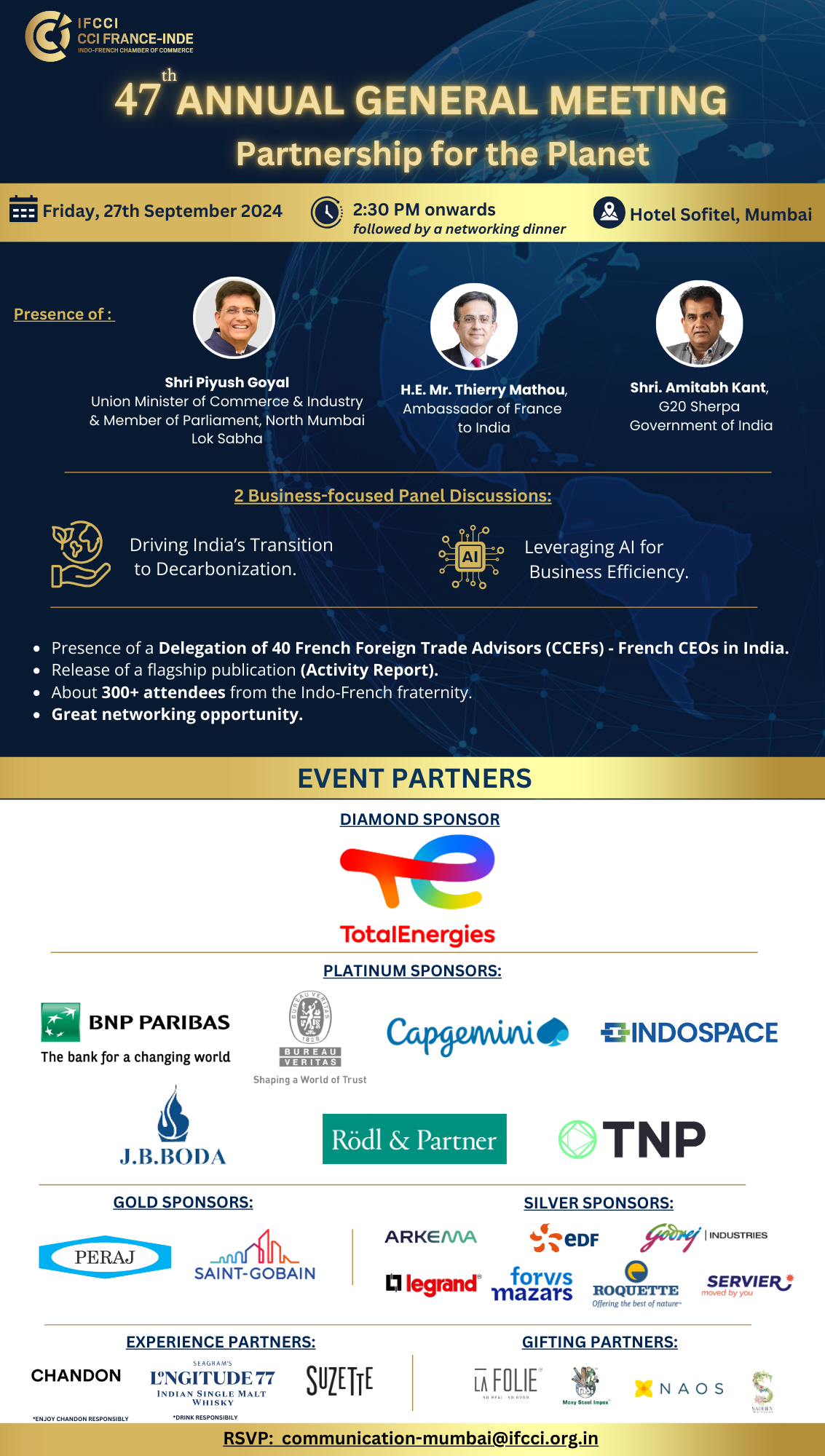The Indo French chamber of Commerce and Industry (IFCCI) is pleased to inform you that our flagship event, the 47th Annual General Meeting (AGM) will take place on Friday, 27th of September at Hotel Sofitel Mumbai, BKC from 2:30 pm onwards, and will be followed by a networking dinner.