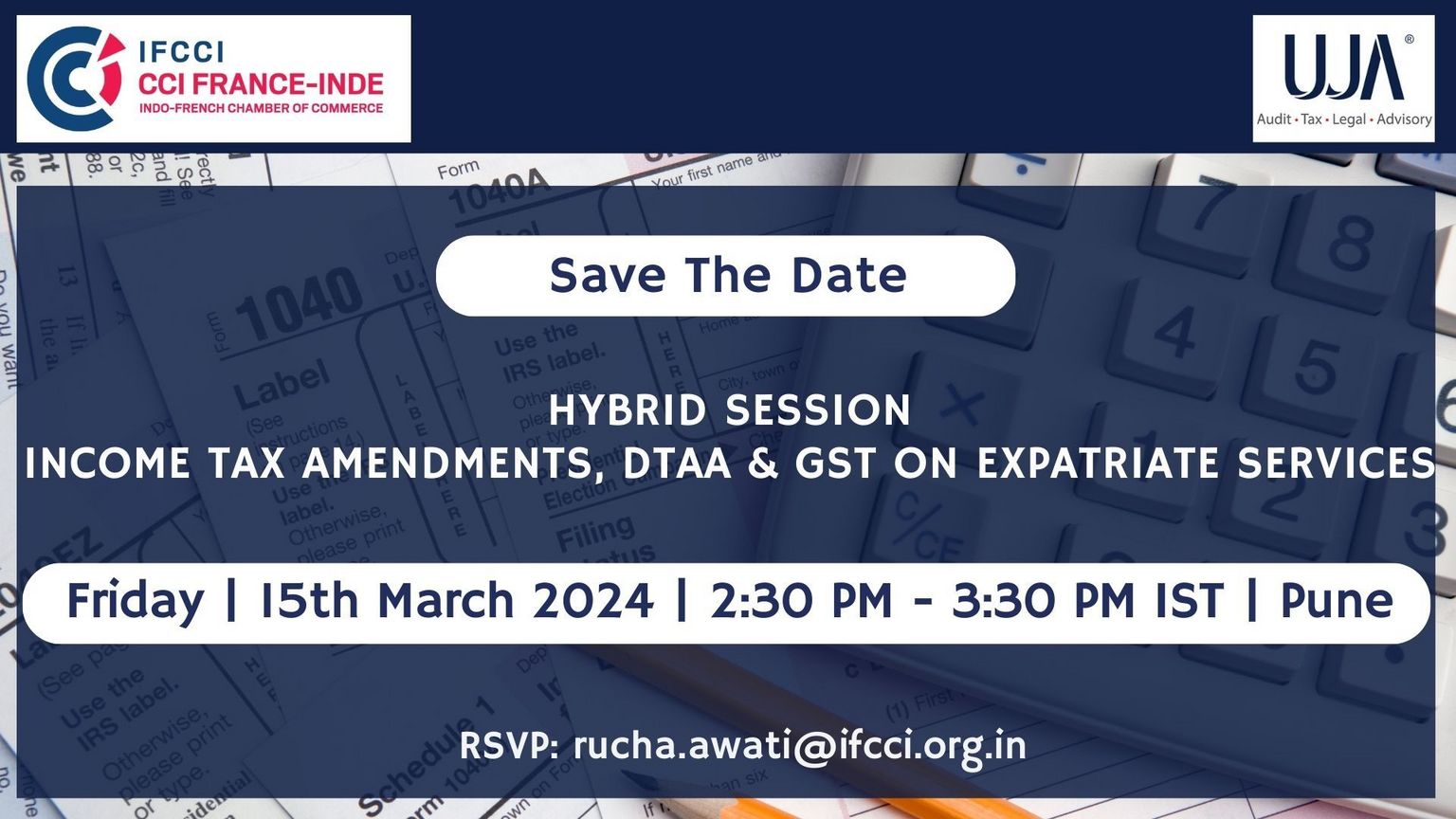 The Indo French Chamber of Commerce & Industry in association with UJA Global Advisory is organizing a hybrid session on ‘Income Tax Amendments, DTAA & GST on Expatriate Services’ on Friday, 15th March 2024 | 2:30 PM – 3:30 PM IST.