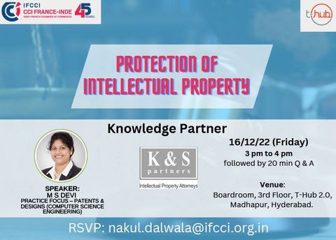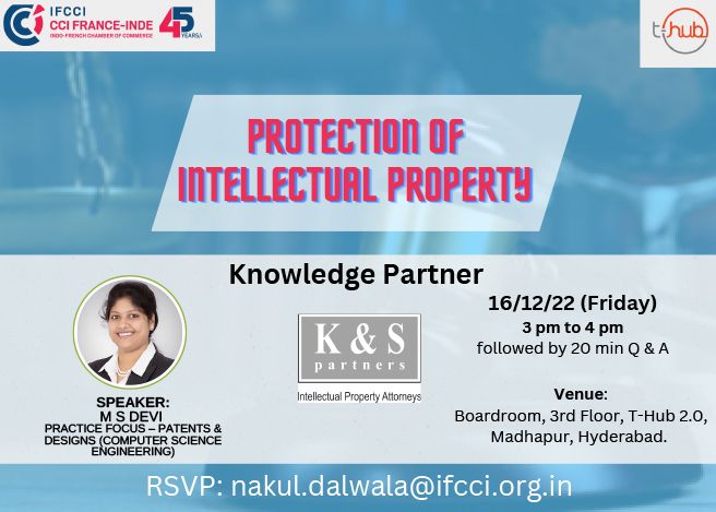 IFCCI is delighted to take forward this association and have arranged an event as a learning workshop for innovative start-ups and companies across sectors to learn from an Industry expert @KNSPartners on the importance of IPR and a cost-effective process to protect ideas and innovations in India and in France / Europe. Our interested members & start-ups are welcome to attend this session at T-Hub in person and make the most of it. The session will be 45 minutes – maximum 60 minutes long with 20 minutes for Q&A .